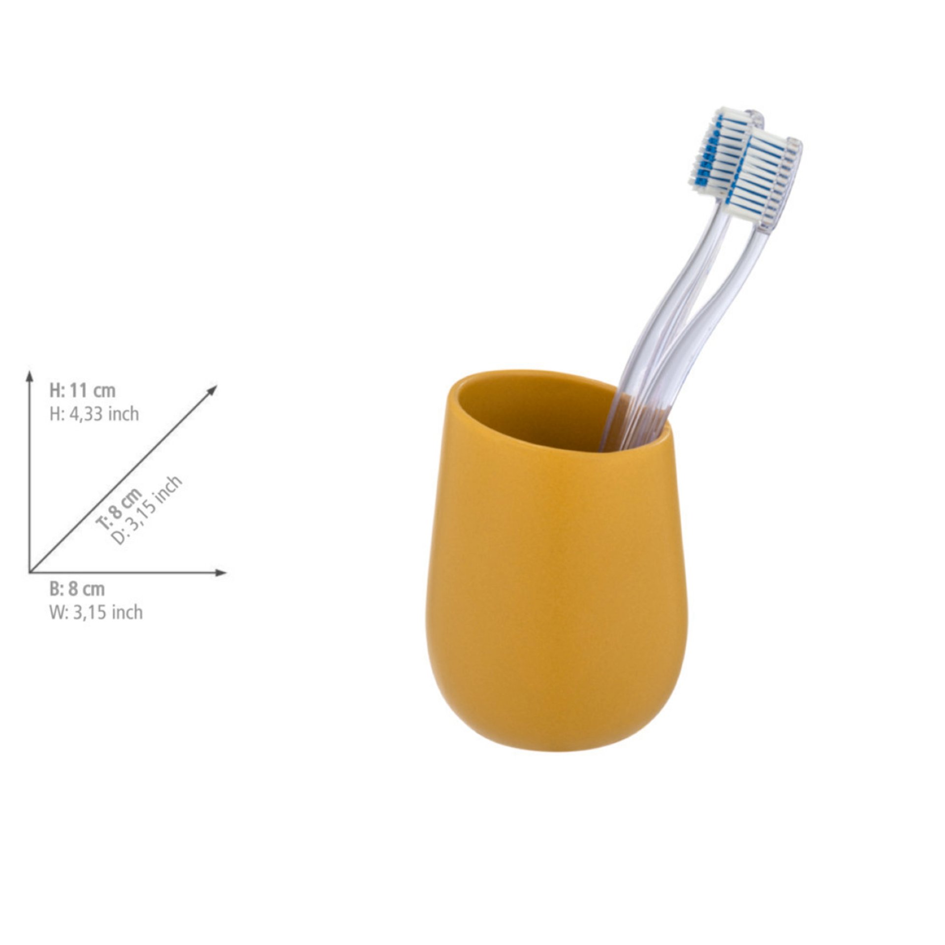 - Im sommerlichen Gelb mit matter Oberfläche wird das 2-teilige Waschtisch-Set Badi zu einem Blickfang in jedem Badezimmer und Gäste-WC. Mit dem Seifenspender und dem Zahnputzbecher haben Sie die ideale Grundausstattung für ihr Waschbecken zur Hand.