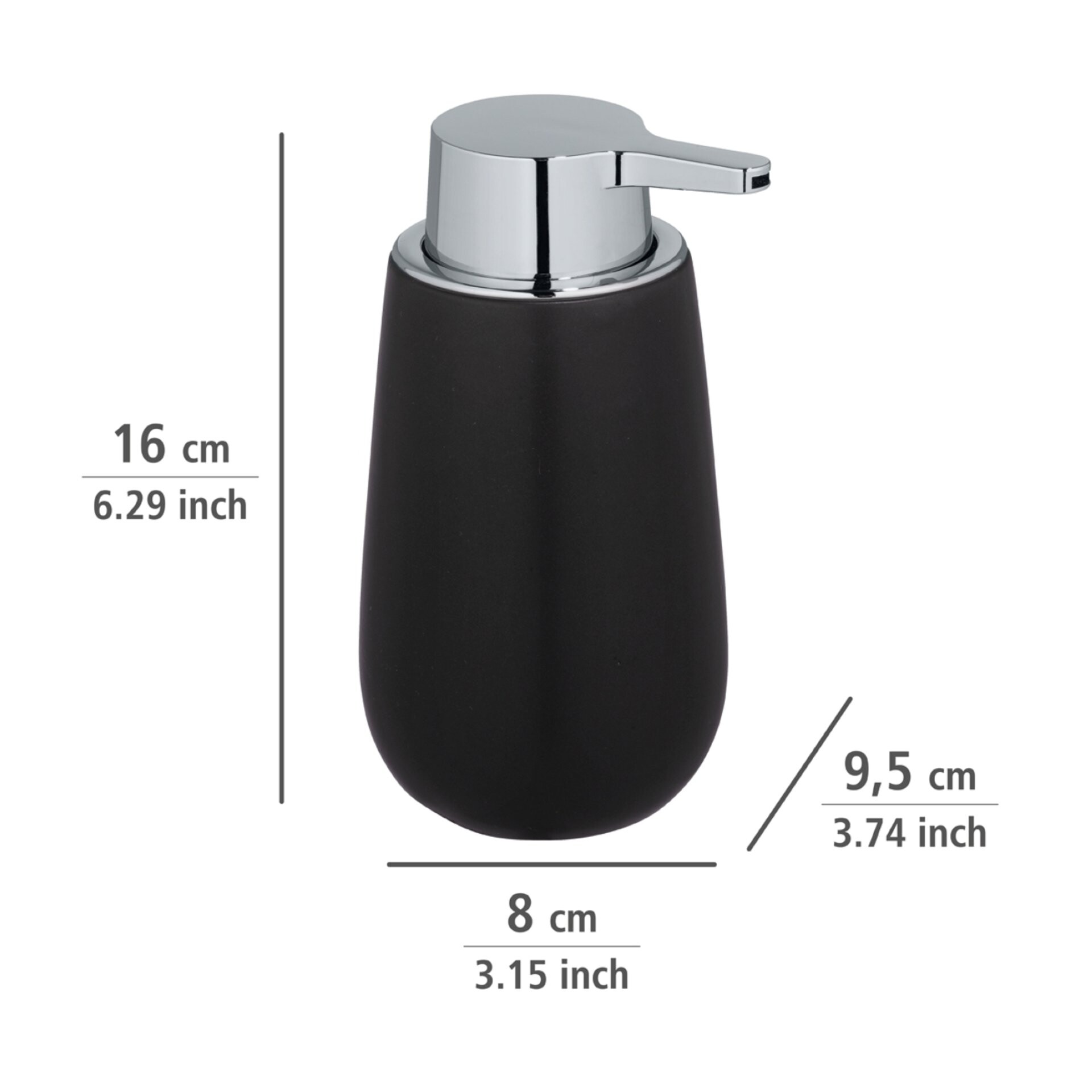 - Im klassischen, schwarzen Gewand mit matter Oberfläche wird der Seifenspender Badi zu einem Blickfang in jedem Bad. Der charmante Seifenspender kann individuell mit 320 ml Flüssigseife oder Lotion befüllt werden. Durch leichten Druck auf den Dosierkopf wird die gewünschte Menge Seife oder Lotion herausgepumpt.
