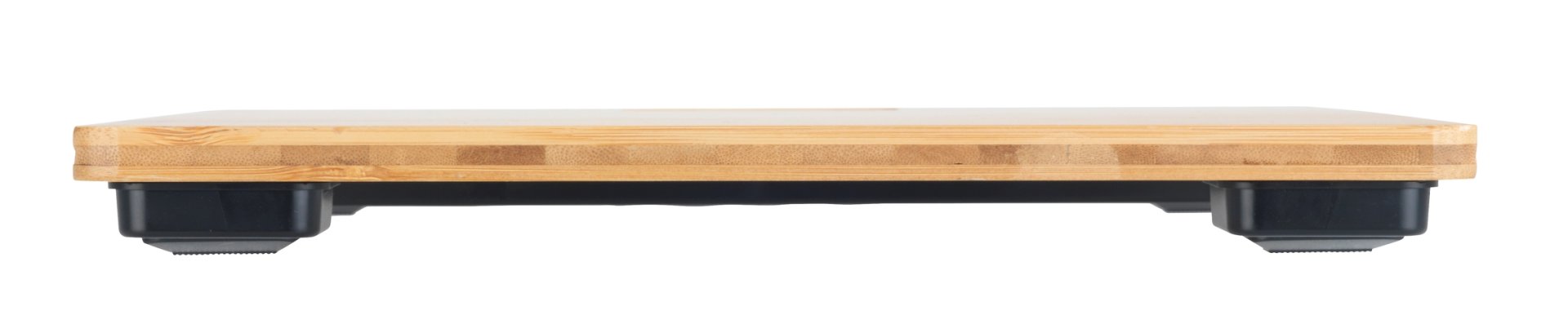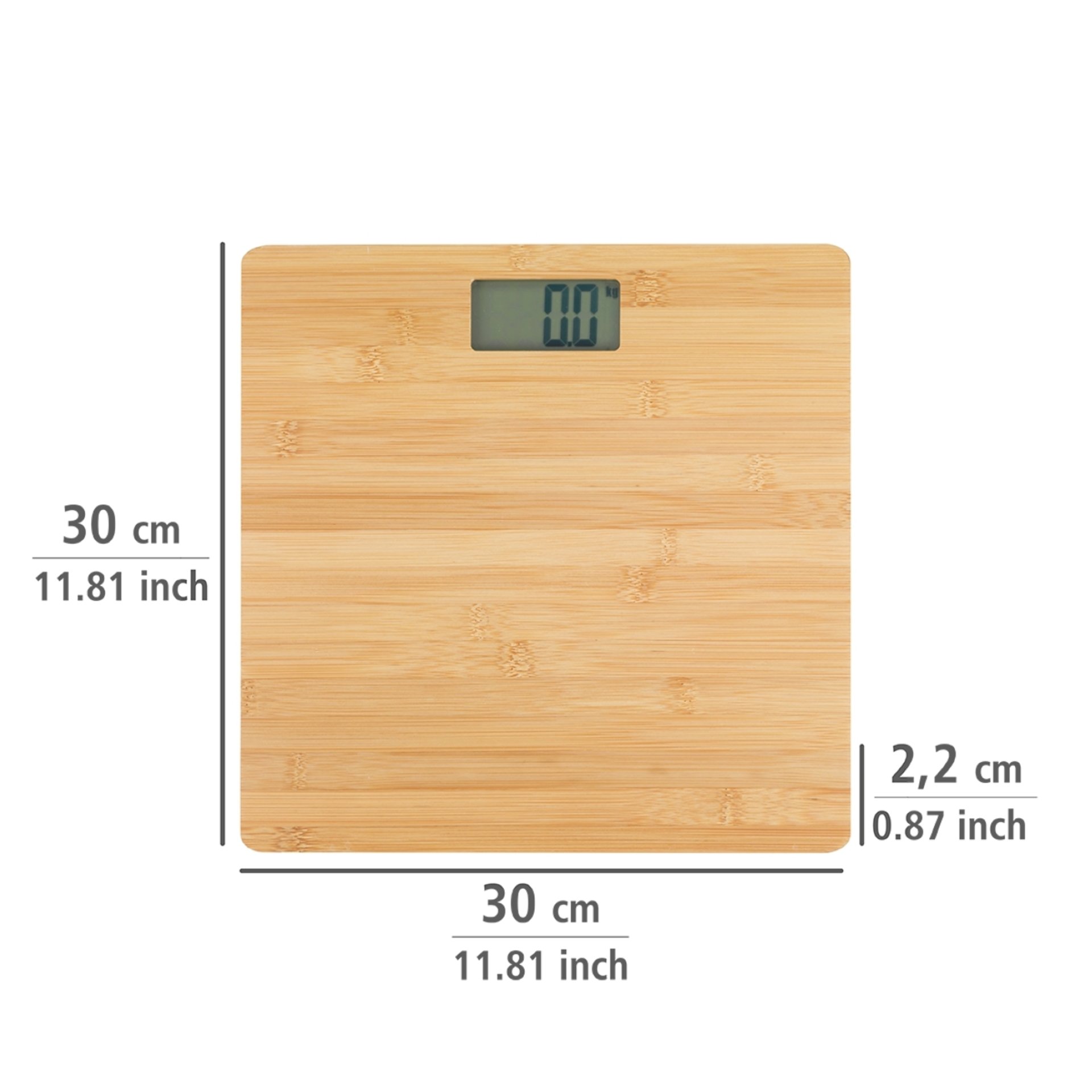 - Mit einer Abmessung von 30 x 2,7 x 30 cm lässt sich die Waage flexibel positionieren – entweder offen präsentiert oder elegant versteckt unter einem Badezimmerschrank, der ausreichend Spielraum zum Boden hat. Aufrecht hingestellt verschwindet die Körperwaage aufgrund ihrer flachen Bauweise auch in kleinen Nischen oder zwischen zwei Schränken. Für einen komfortablen Stand ist ebenfalls gesorgt, da Bambus verglichen mit anderen Materialien wie Glas oder Metall angenehm warm ist.