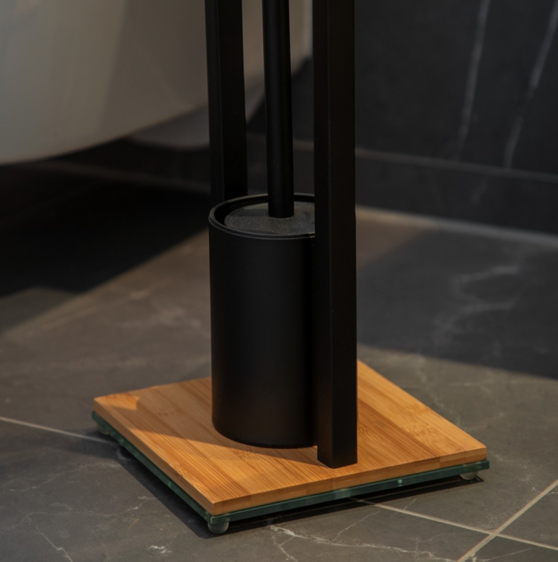 - Das Gerüst ist aus matt lackiertem und zugleich robustem Stahl gefertigt. Gestützt wird die praktische Konstruktion durch eine schwere Glasplatte, die mit hochwertigem Bambus kombiniert für einen trendigen Loft-Charakter sorgt. Zeitgleich ist so ein sicherer Stand beständig gesichert und der Alltagshelfer eignet sich somit bestens zur flexiblen Positionierung in Bad und Gäste-WC. Die schmale Formgebung ermöglicht auch in schmalen Bädern eine optimale Platzierung.