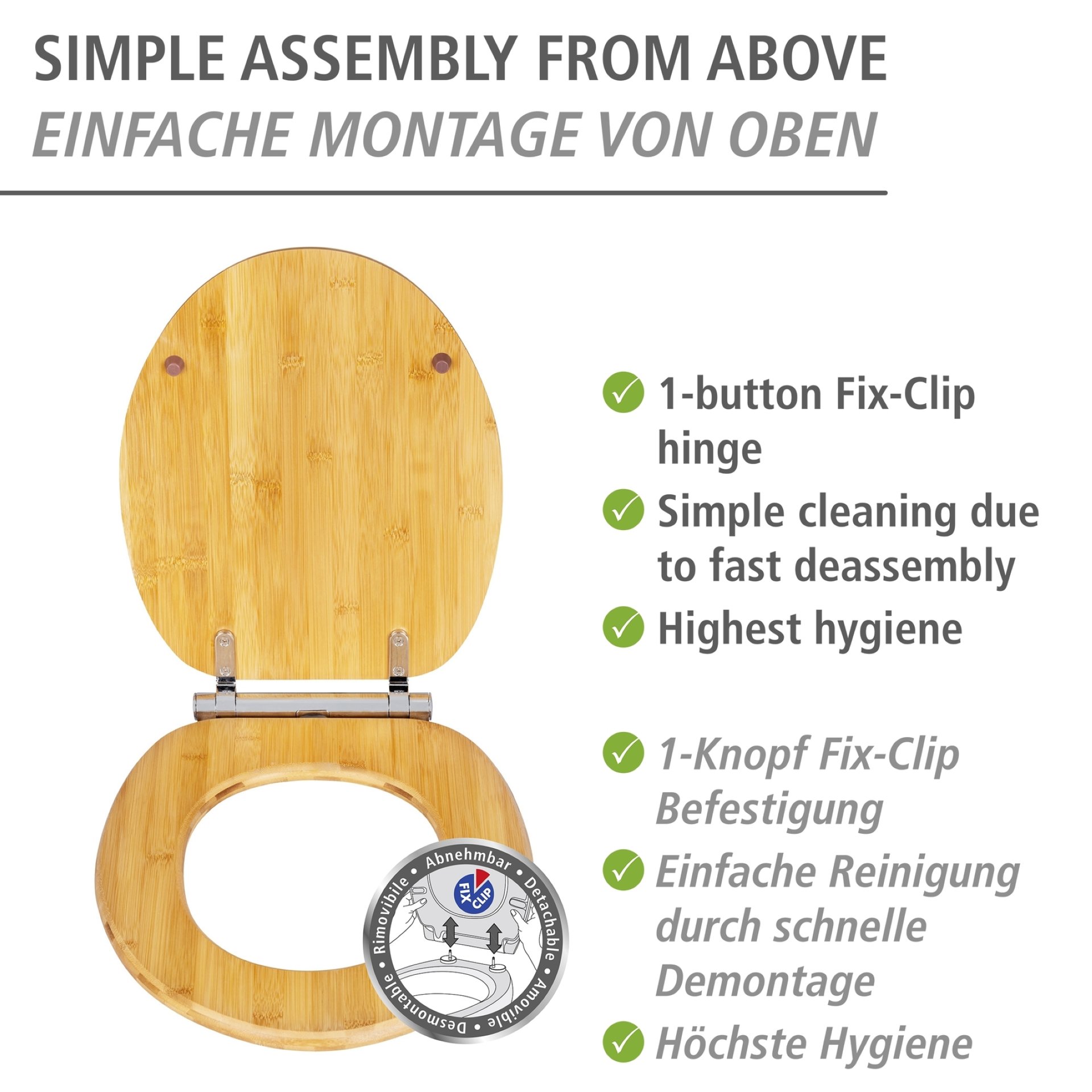 - Dank der externen Easy-Close-Absenkautomatik gehört lautes Deckelknallen der Vergangenheit an. Zuverlässig schließt der Toilettendeckel sanft und leise. Als weitere praktische Zusatzfunktion verfügt der WC-Sitz Bambusa über eine 1-Knopf-Fix-Clip Hygienebefestigung aus stabilem Kunststoff (ABS).