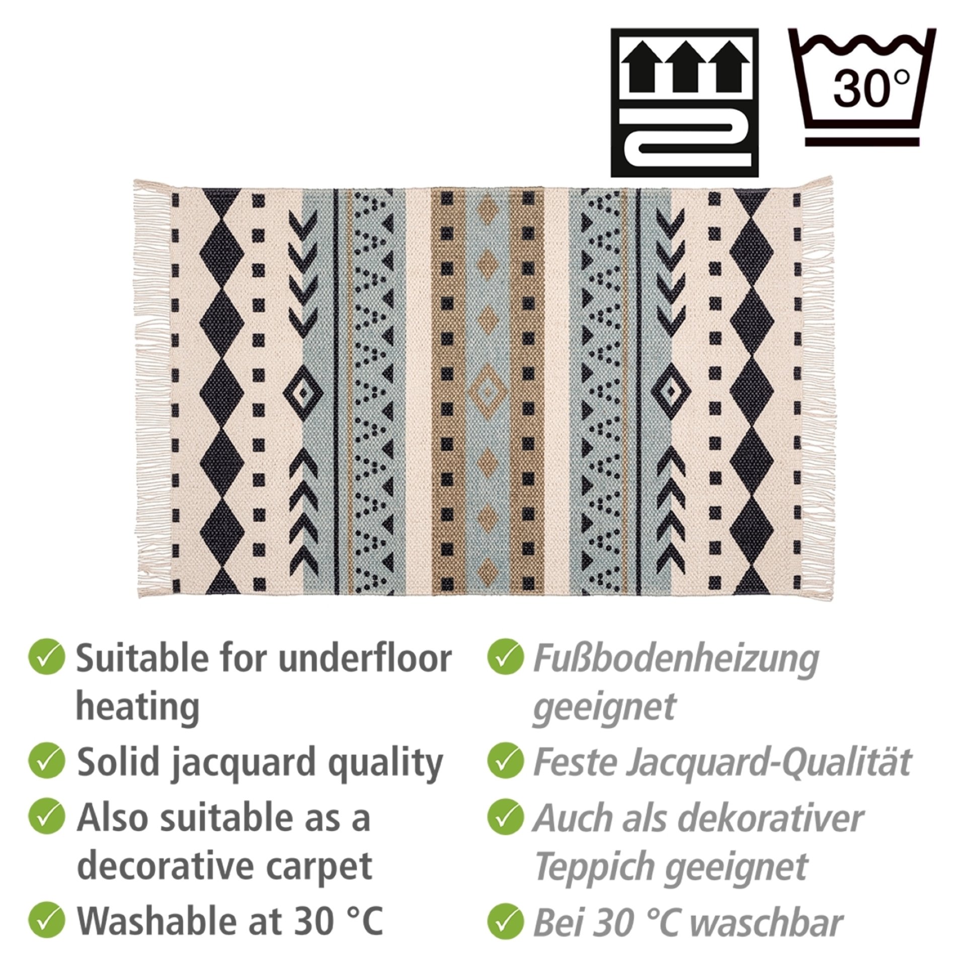 - Sie wollen Ihrem Bad einen natürlichen und gleichzeitig modernen Look verpassen? Mit der Badematte Bere liegen Sie voll im Trend. Das symmetrische Ethno-Muster in Blau- und Beigetönen, kombiniert mit Schwarz, verleiht ihrem Bad-Fußboden einen angesagten Touch. Die Matte eignet sich mit ihren Maßen von (B x T): 50 x 80 als Duschvorleger, Badematte vor der Wanne oder dem Waschbecken oder als dekorativer Teppich. Die Unterseite der Badematte ist rutschhemmend beschichtete, sodass sie auch auf Fliesen für einen sicheren Stand sorgt. Die Matte ist bei bis zu 30°C waschbar und für Fußbodenheizung geeignet.