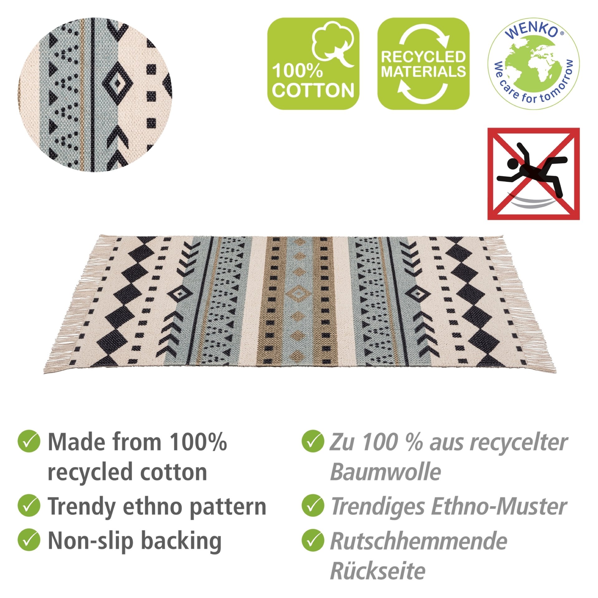 - Die Badematte Bere besteht aus 100 % Baumwolle und ist garngefärbt. Sie ist zudem von fester Jacquard-Qualität. Die natürliche Struktur des Badteppichs wird durch das trendige Motiv perfekt ergänzt. Geometrische Formen zieren die helle Matte im bunten Ethno-Look und machen sie zu einem Blickfang, der Natürlichkeit versprüht. Die Fransen an den kurzen Seiten der Badematte sorgen für ein zusätzliches Highlight. Die Farbvielfalt ermöglicht die Kombination mit Bad-Accessoires in verschiedenen Farben – etwa in Hellblau, Schwarz oder Beige. Badhelfer aus Bambus unterstreichen den natürlichen Ethno-Style besonders gut.