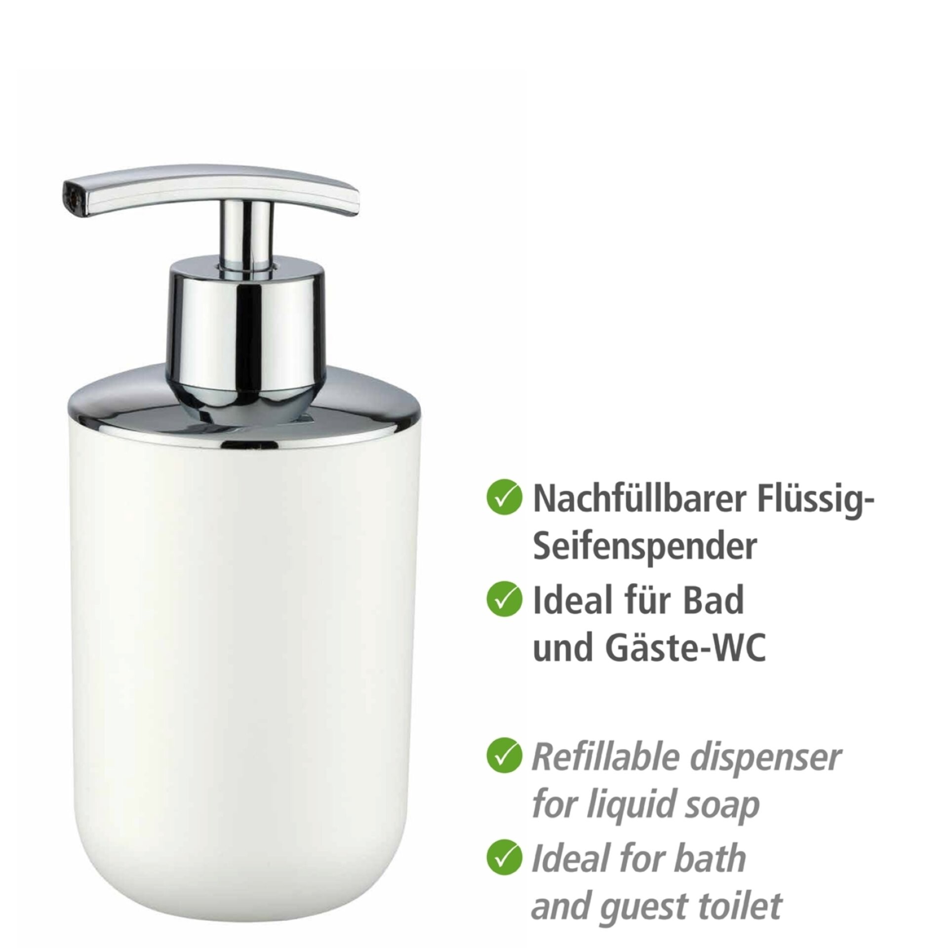 - Der Seifenspender überzeugt durch Qualität und Design. Der Aufsatz ist verchromt und wirkt harmonisch mit dem unteren Teil des Spenders zusammen. Der hübsche Spender kann individuell mit 320 ml Flüssigseife oder Waschlotion gefüllt werden. Durch leichten Druck auf den Dosierknopf wird die gewünschte Menge Seife bzw. Lotion herausgepumpt.