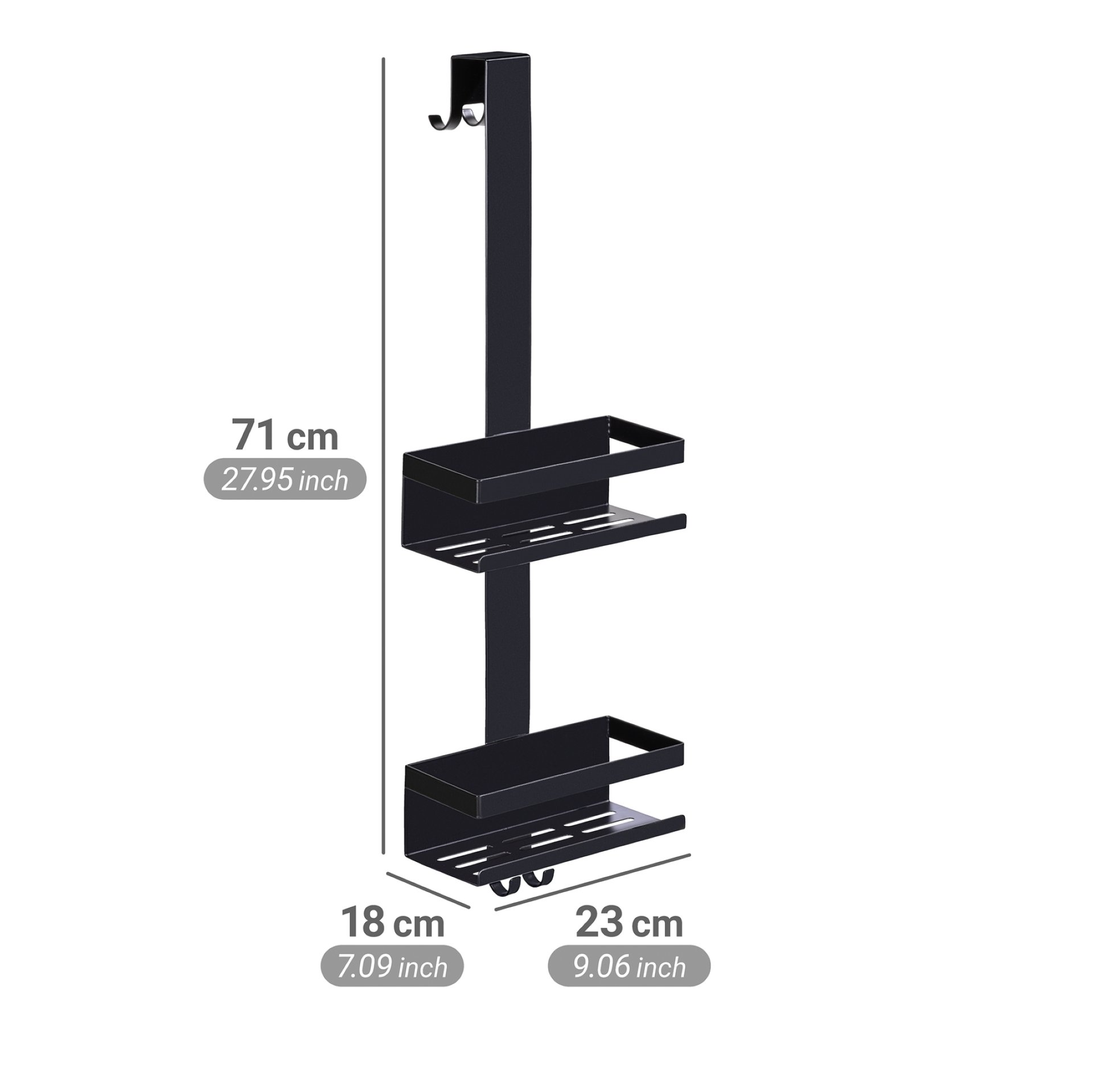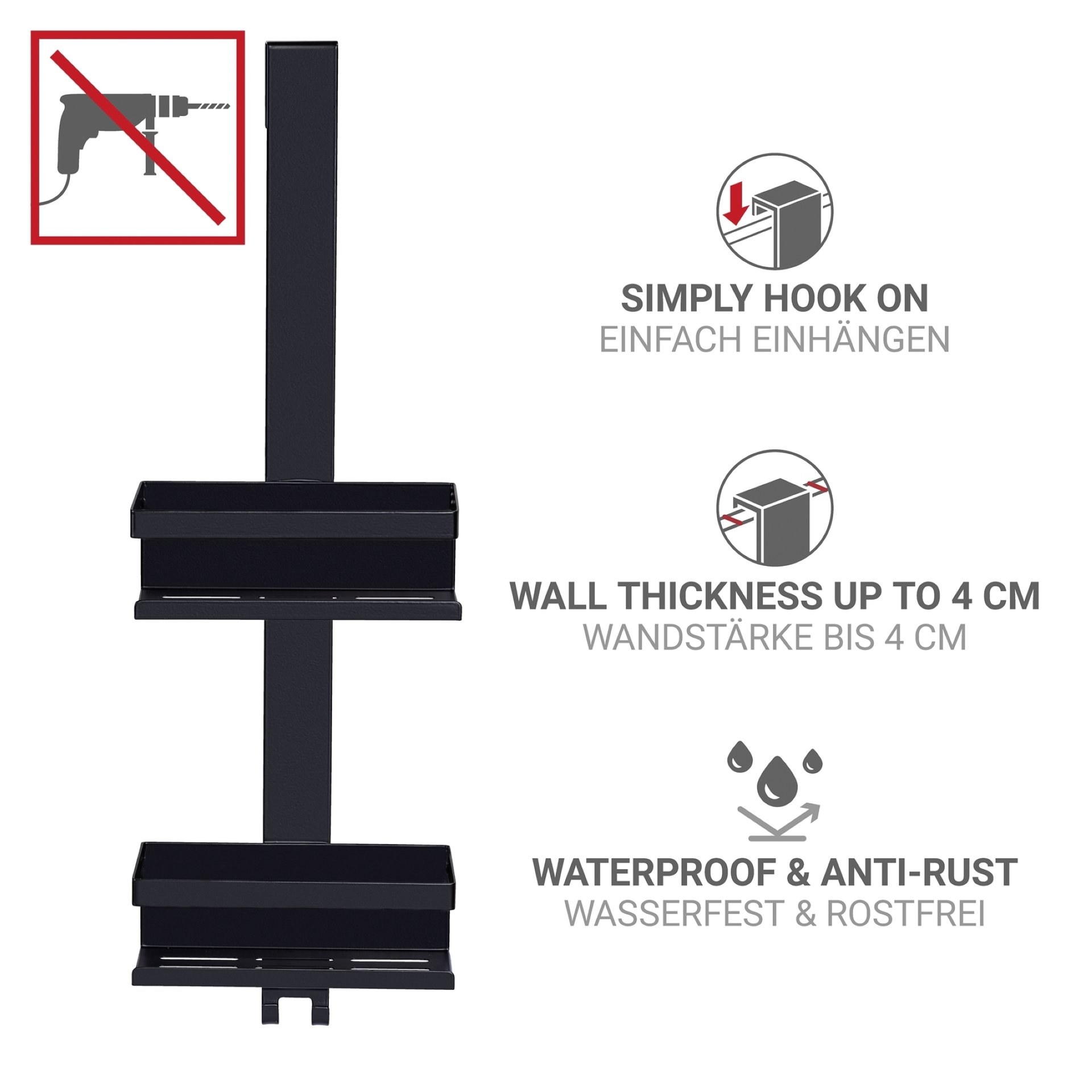 - Das schwarze Duschregal ist ideal zum Einhängen an Duschkabinen und Türen mit einer Wandstärke von bis zu 4 cm. Mit seinen Maßen von 23 cm Breite, 71 cm Höhe und 18 cm Tiefe bietet das Hängeregal Dusche ausreichend Platz, um Ordnung in Ihr Badezimmer zu bringen. Verlassen Sie sich auf das rostfreie Duschregal für eine langlebige und elegante Lösung, die Ihr Duschvergnügen bereichert.