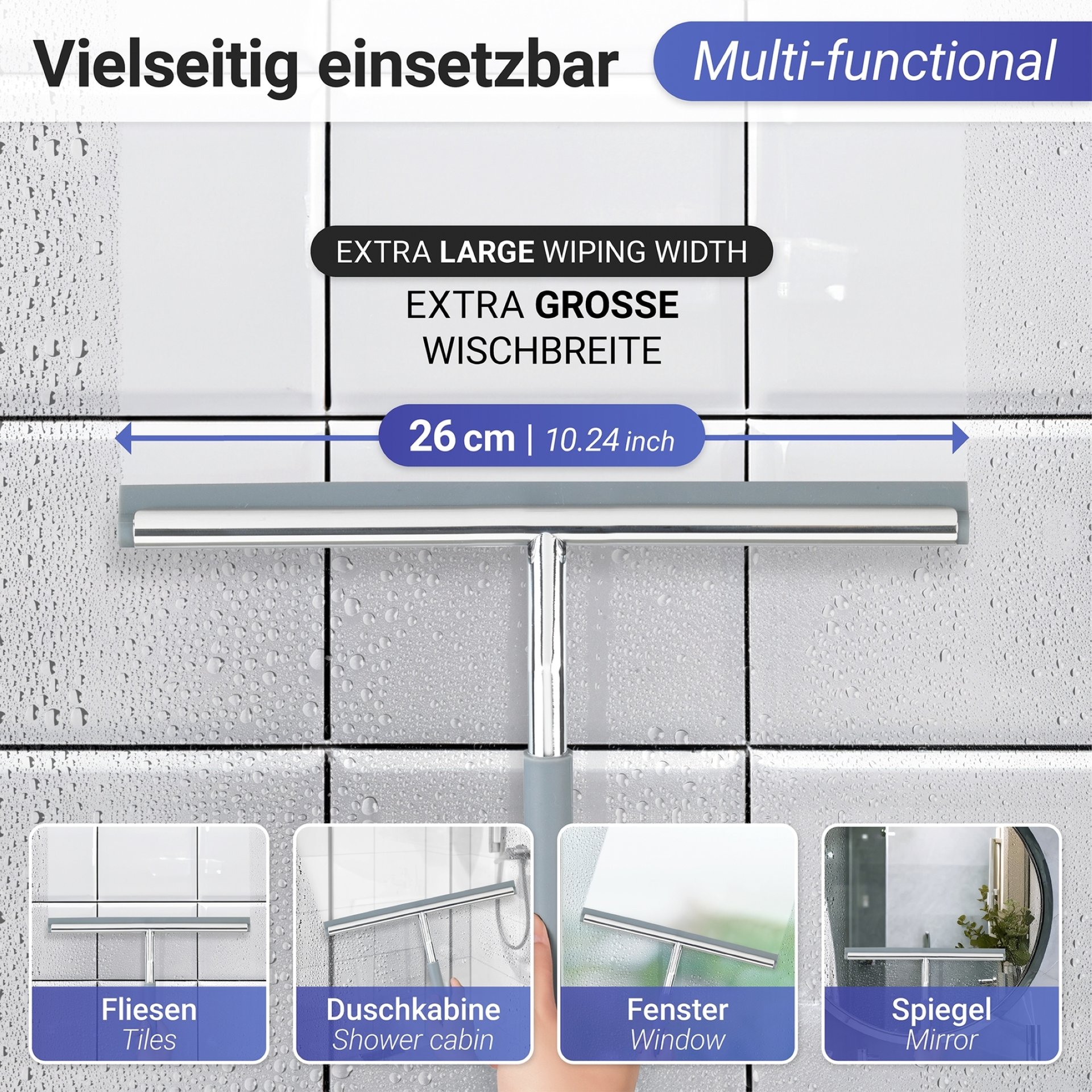 - Der Griff des nützlichen Badhelfers liegt während der Reinigung gut in der Hand und ermöglicht so ein sanftes Abziehen der Flächen. Durch die Hängevorrichtung für die Duschwand, die im Lieferumfang enthalten ist, kann man den Badezimmerwischer problemlos und ohne lästiges Bohren platzieren.