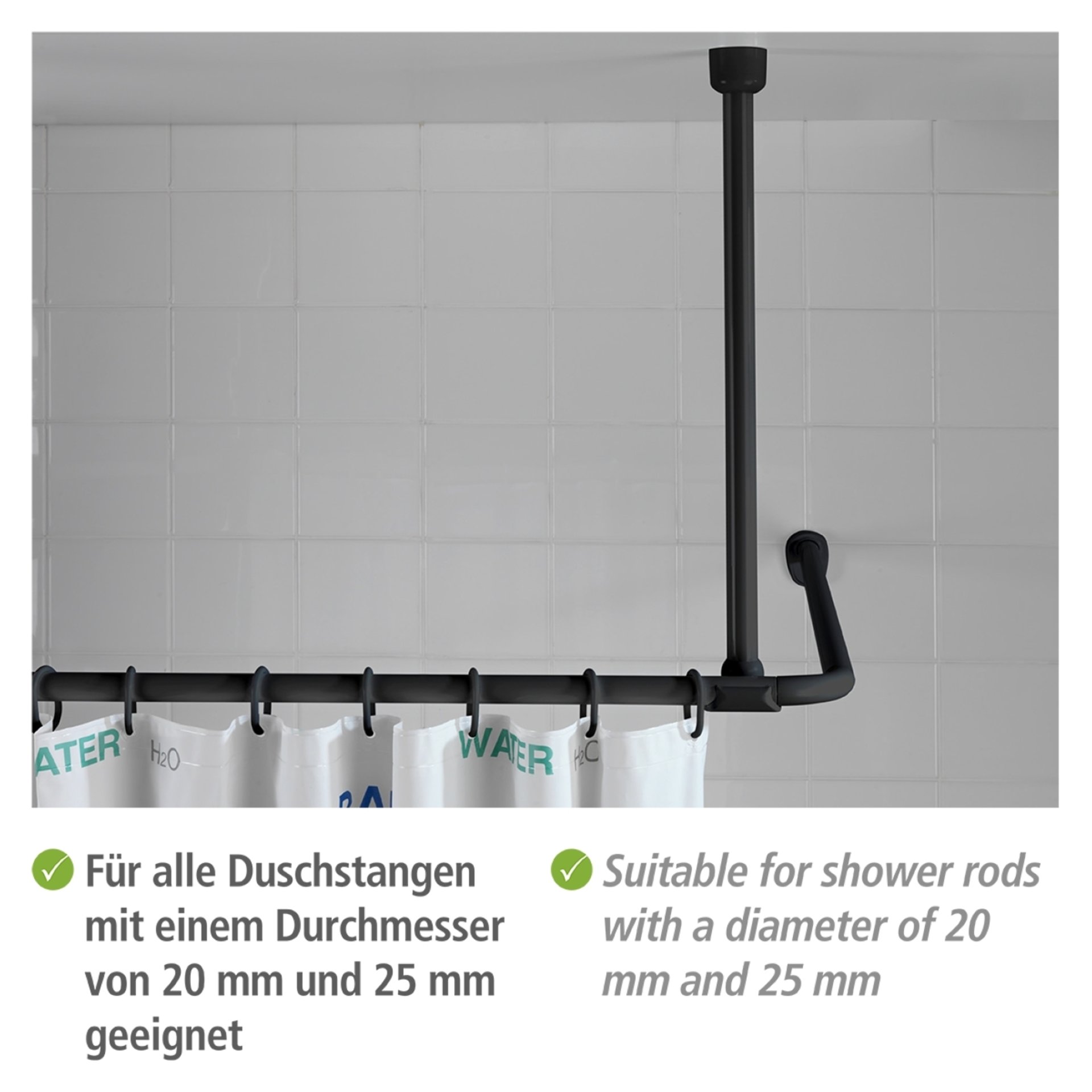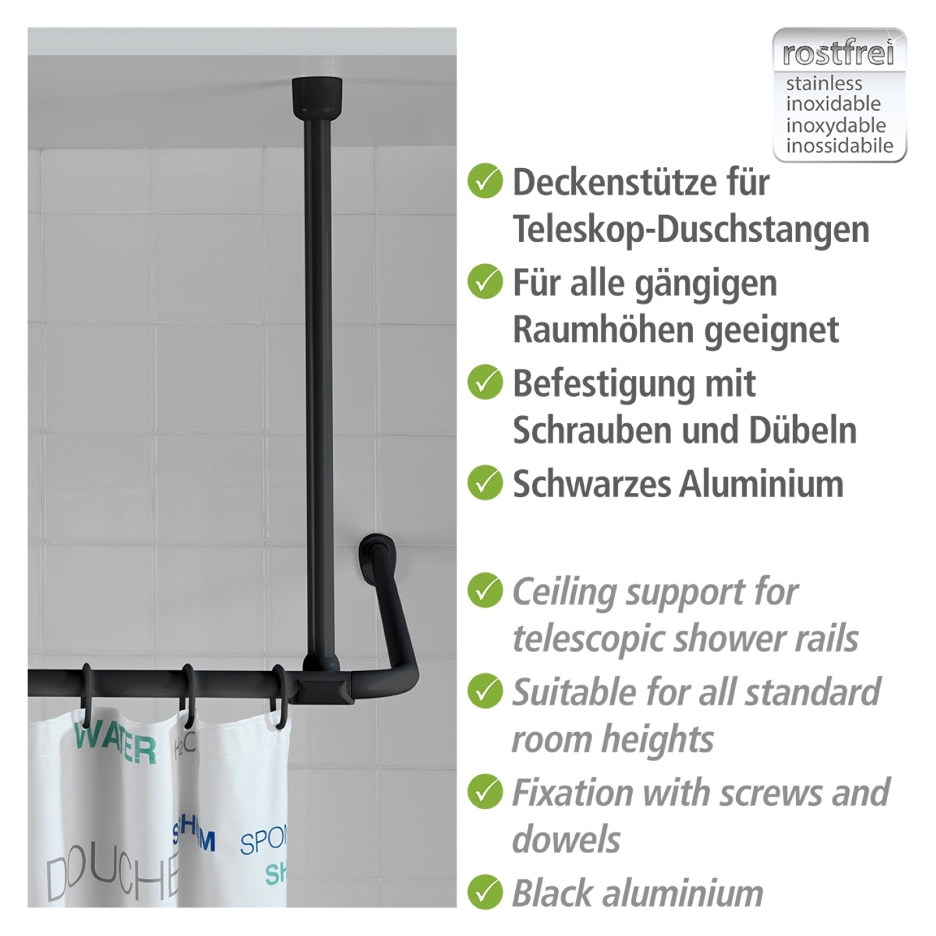 - Die stabile Deckenstütze ist aus hochwertigem Aluminium gefertigt und für Duschstangen mit einem Durchmesser von 20 mm und 25 mm geeignet.