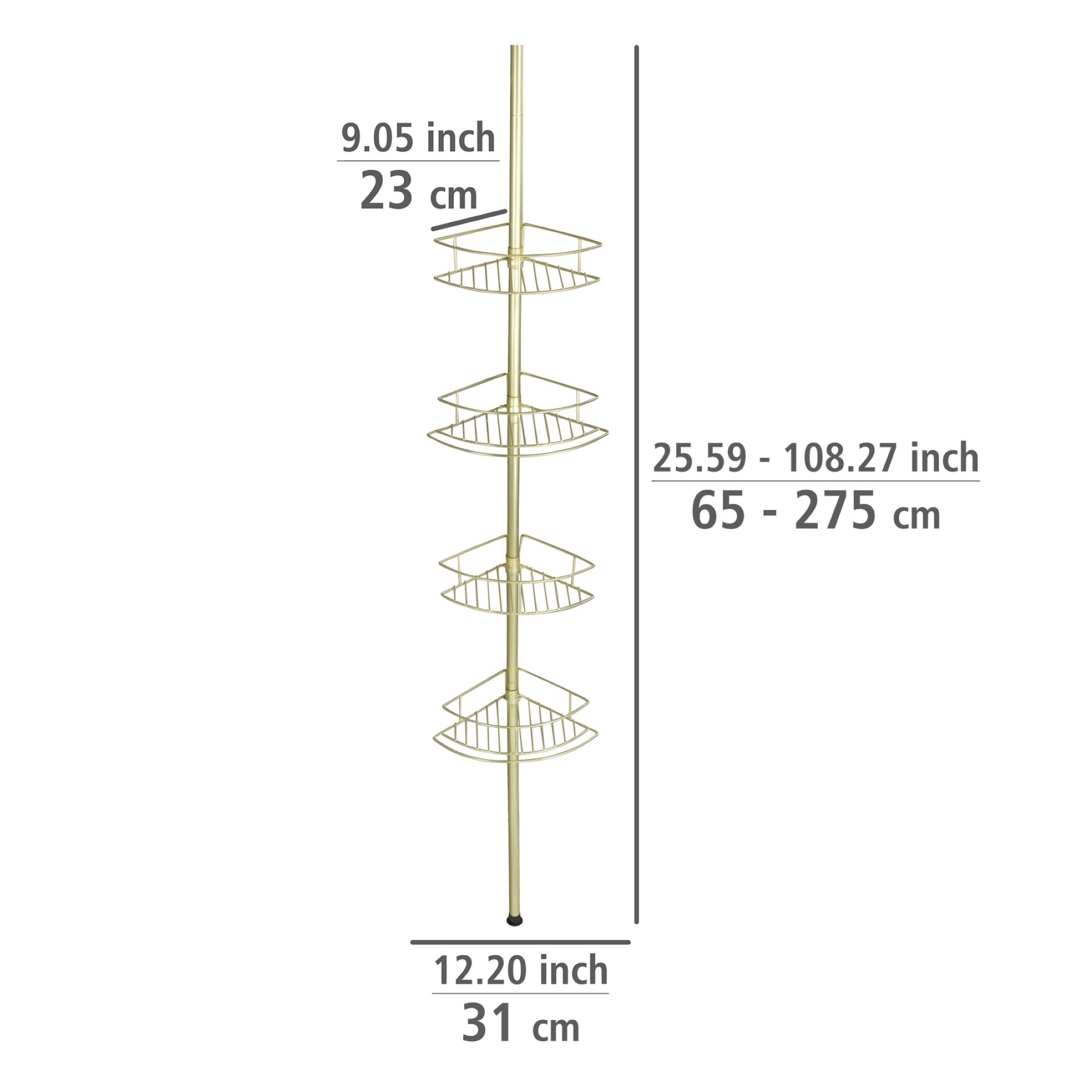 - Das praktische Eckregal in mattem Gold bietet mit vier Drahtkörbchen zahlreiche Abstellmöglichkeiten für Shampoo, Duschbad, Seife, Schwamm und andere Badeutensilien. Zwei Körbe haben eine zusätzliche Halterung, um Waschlappen, etc. einzuhängen.