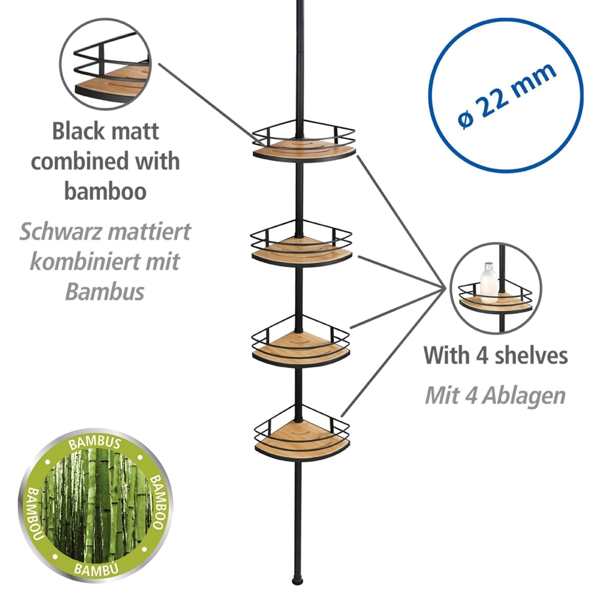 Das hochwertige Teleskop-Eckregal Dolcedo Bambus ist universell einsetzbar in Duschkabinen, Badewannen- und Zimmerecken. Das angesagte Design aus rostfreiem, schwarz-mattiertem Edelstahl in Kombination mit Bambus wertet jedes Bad auf. Bambus ist nicht nur hart und widerstandsfähig - auch unter ökologischen Aspekten bietet das Material Vorteile: Bambus ist ein schnell nachwachsender Rohstoff und liegt absolut im Trend.