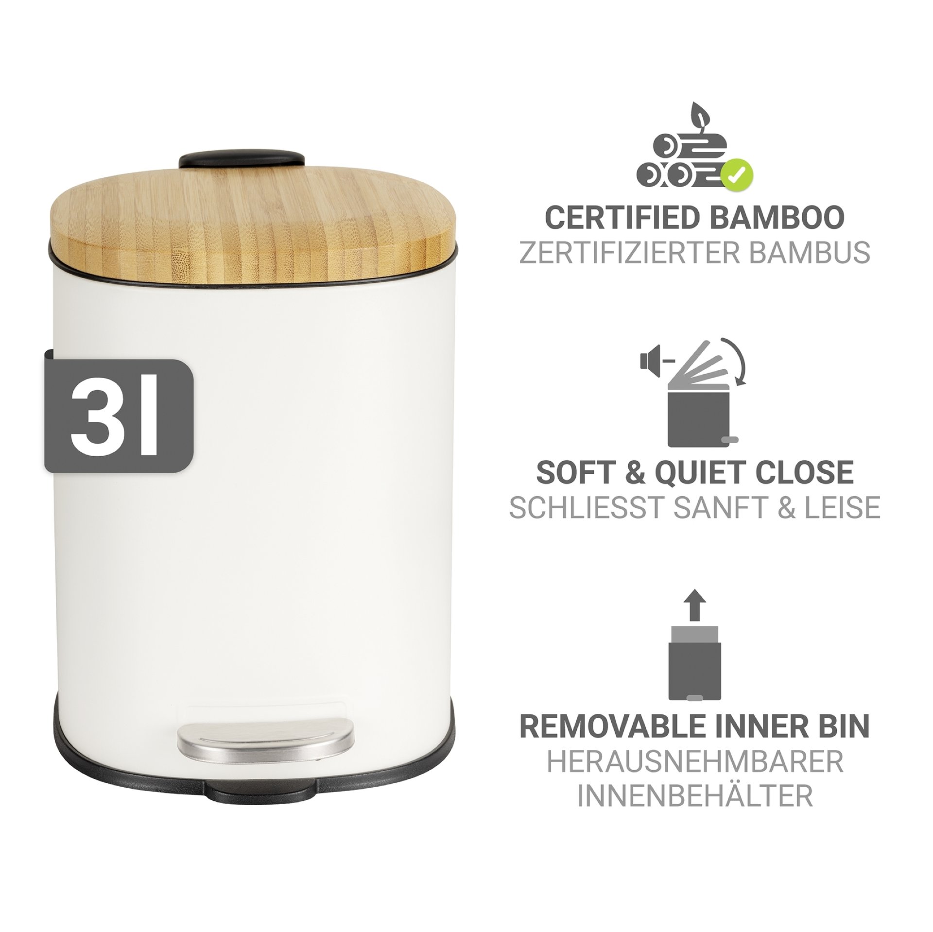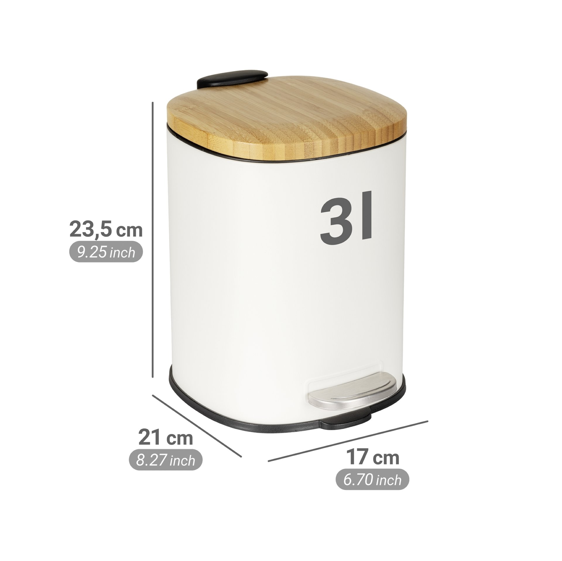 Der elegante Kosmetikeimer Treteimer Fianema von WENKO setzt mit seiner ansprechenden Kombination aus mattiertem, weißem Stahl und FSC®-zertifiziertem Bambus Akzente in jedem Badezimmer und Gäste-WC. Dieser moderne weiße Treteimer im angesagten Retro-Look vereint sich mit hoher Funktionalität. Der smarte 3L Mülleimer passt mit seinen überschaubaren Maßen von (B x H x T): 17 x 23,5 x 21 cm auch in kleinere Bäder oder Gäste-WCs und ist damit ideal als Kosmetikeimer einsetzbar. Durch die freistehende Bauweise kann der Eimer flexibel platziert werden und hält durch die integrierte Tretfunktion auch bei direktem Kontakt den Deckel ruhig. Dieser schließt dank der innovativen Easy-Close Absenkautomatik sanft und leise, ohne lautes Aufknallen. Der herausnehmbare Innenbehälter aus schwarzem Kunststoff mit zwei integrierten Beuteln sorgt für extra Komfort bei der Entsorgung des Inhalts und eine schnelle Reinigung des Eimers.
