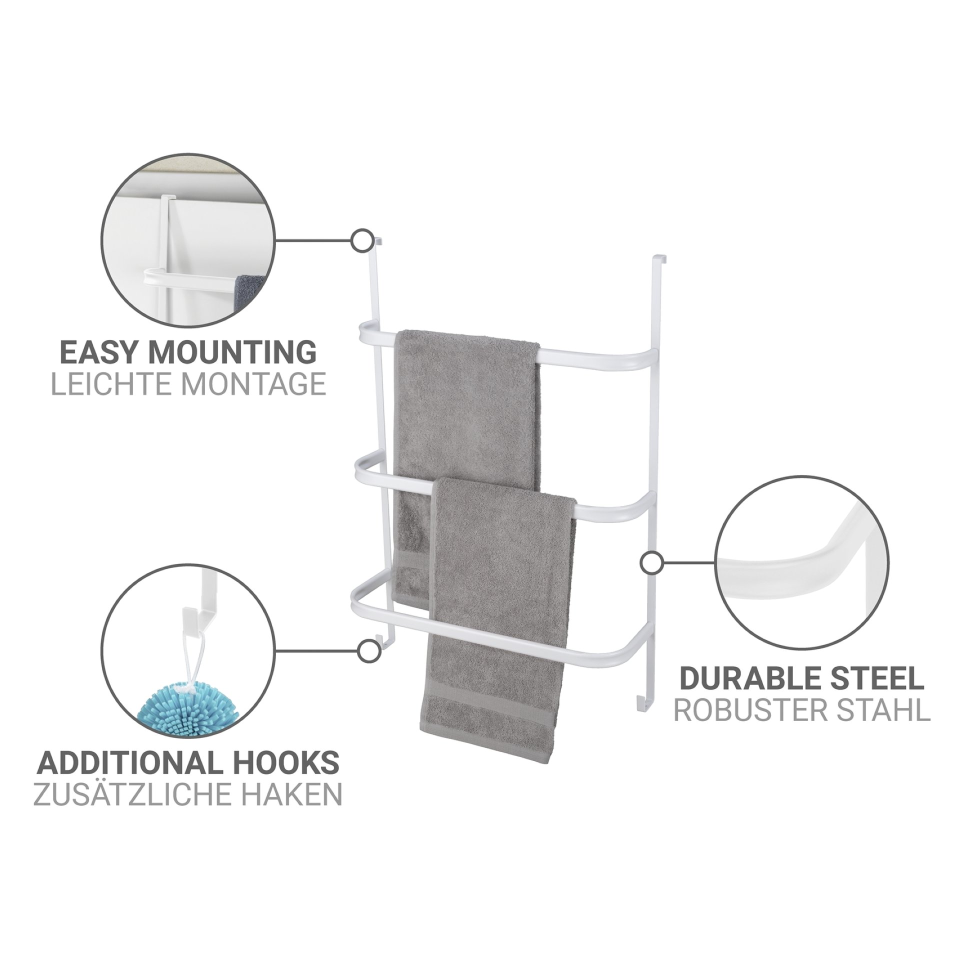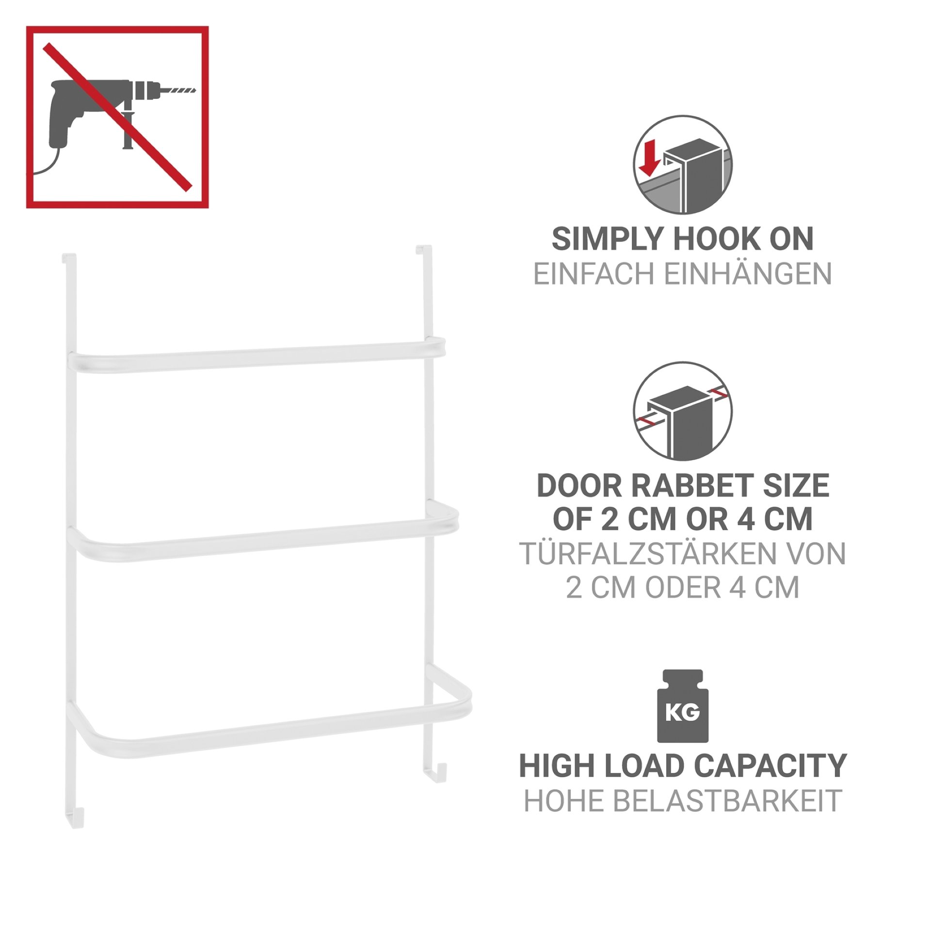 - Der Handtuchhalter Irpinia ist ein echtes Multitalent unter den Badmöbeln! Er verfügt über eine spezielle Anbringung für die Tür und die Dusche, die für Türfalzstärken von 2 cm und 4 cm geeignet ist. Der Hängende Handtuchhalter hält Ihre Handtücher stets ordentlich und griffbereit. Hergestellt aus hochwertigem Handtuchhalter-Metall, garantiert er eine hohe Belastbarkeit und eine lange Lebensdauer. Seine pflegeleichte weiße Oberfläche fügt sich harmonisch in jedes Badmöbel-Set ein und verleiht Ihrem Badezimmer einen modernen Touch, der die Atmosphäre aufwertet.