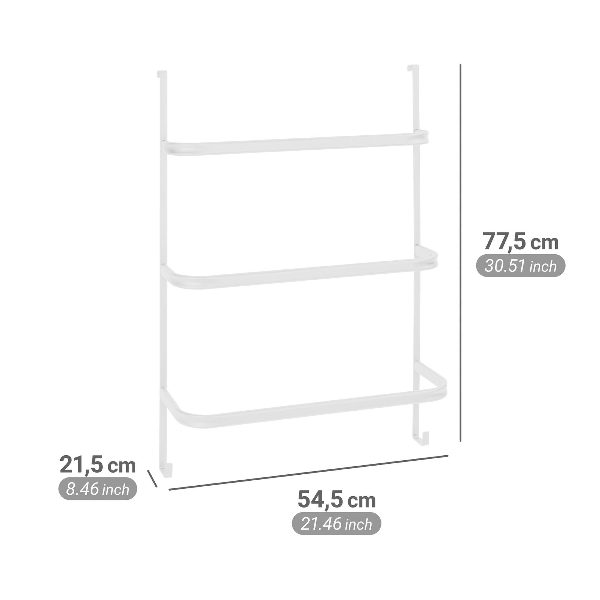 - Mit einer Breite von 54,5 cm, einer Höhe von 77,5 cm und einer Tiefe von 21,5 cm bietet der Handtuchhalter genügend Platz für all Ihre Badtextilien. Die leichte Montage ermöglicht es Ihnen, den Handtuchhalter schnell und ohne großen Aufwand zu installieren. Egal ob Sie ihn in der Dusche oder an der Tür nutzen, der Handtuchhalter Irpinia sorgt für Ordnung und Stil.