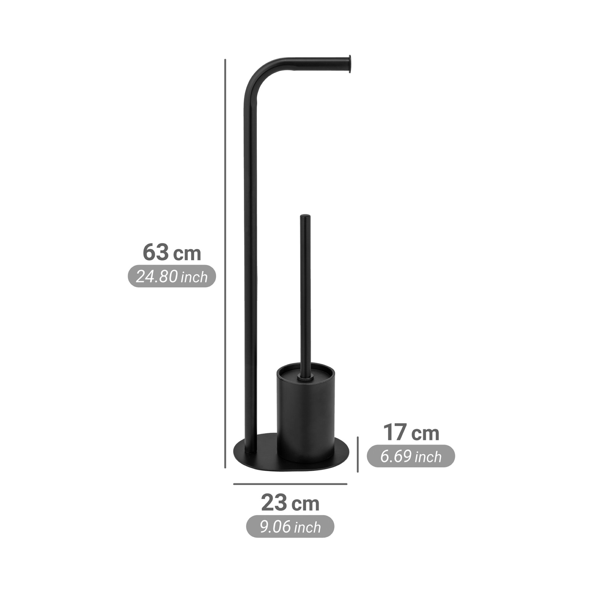 - Mit einer Breite von 23 cm, einer Höhe von 63 cm und einer Tiefe von 17 cm fügt sich die Stand WC-Garnitur harmonisch in Ihr Badezimmer ein, ohne viel Platz zu beanspruchen. Der Bürstenkopf hat einen Durchmesser von 7,5 cm und ist in elegantem Schwarz gehalten, was den modernen Look unterstreicht. Die aus rostfreiem, matt schwarz lackiertem Stahl bestehende WC-Garnitur garantiert Langlebigkeit und Qualität, sodass Sie lange Freude daran haben werden.