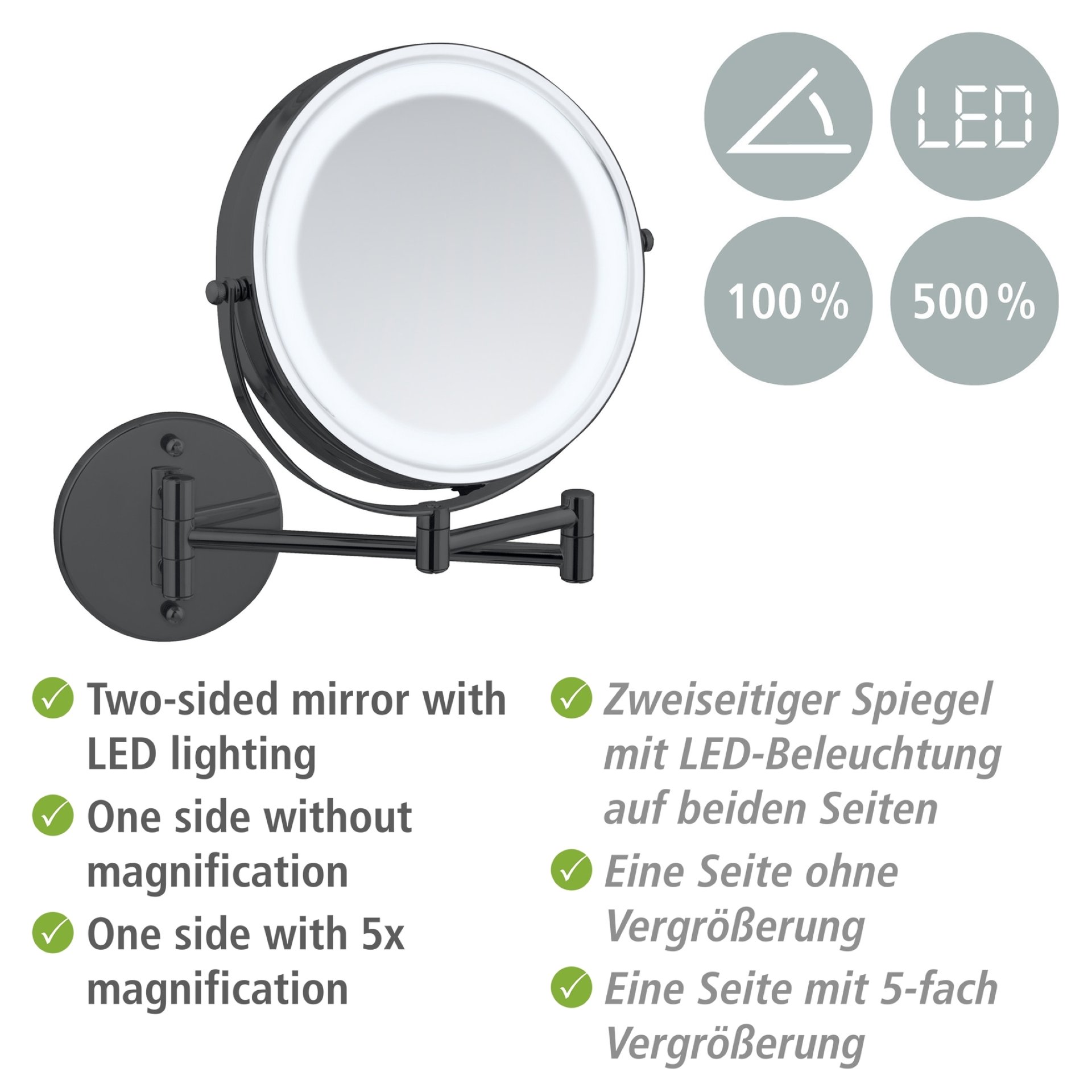 WENKO LUMI Kosmetikspiegel Ø 17,5 cm, Schwarz, 5-fach Vergrößerung, zur Wandmontage