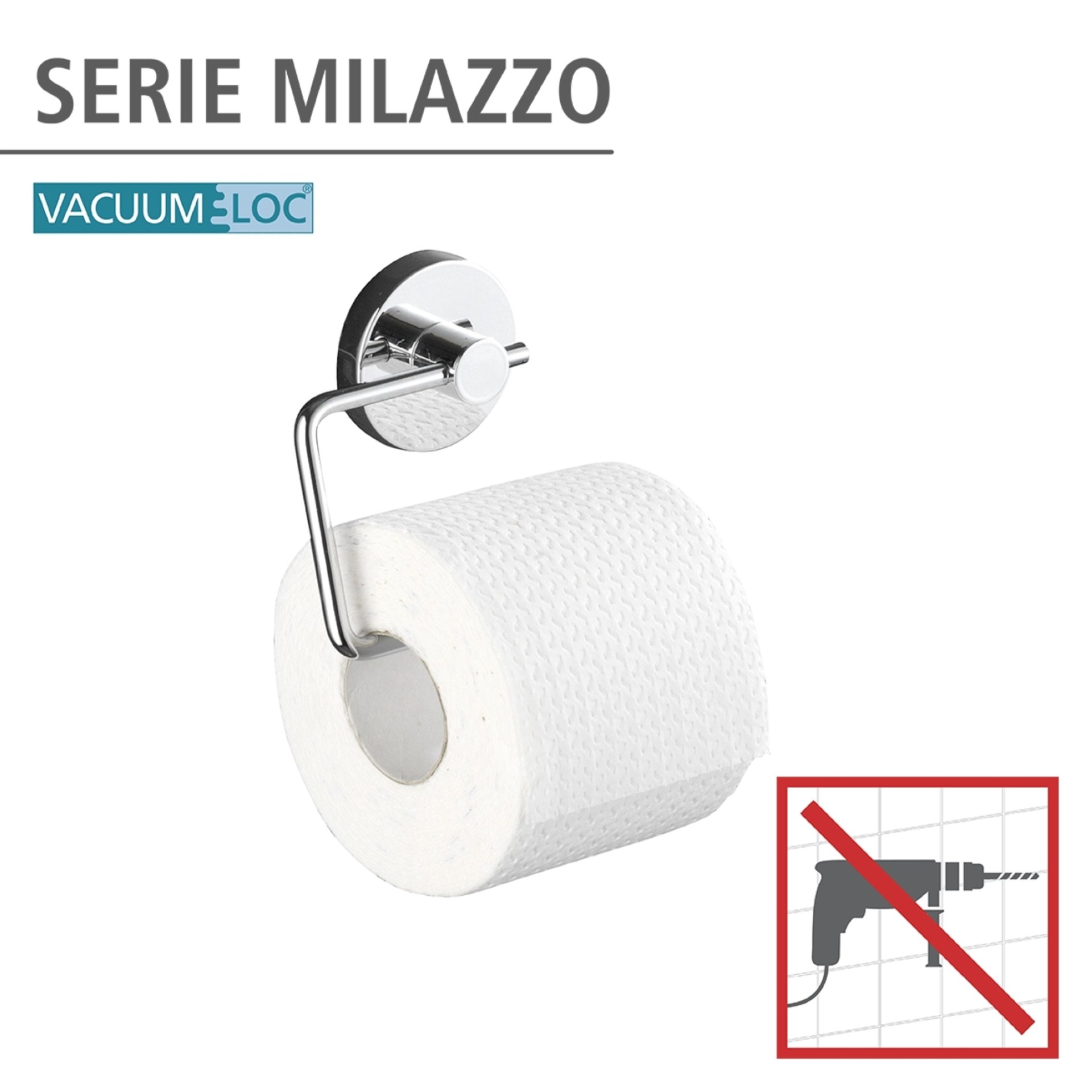 - So befestigen Sie auch den Vacuum-Loc® Toilettenpapierhalter aus der Bad-Serie Milazzo im Handumdrehen. Der Rollenhalter kann flexibel an der Wand neben dem WC angebracht werden, somit ist das Toilettenpapier in Badezimmer und Gäste-WC immer griffbereit. Der Halter für Papierrollen ist aus stabilem, verchromten Stahl gefertigt und misst insgesamt (B x H x T): 13 x 10,5 x 3,5 cm.