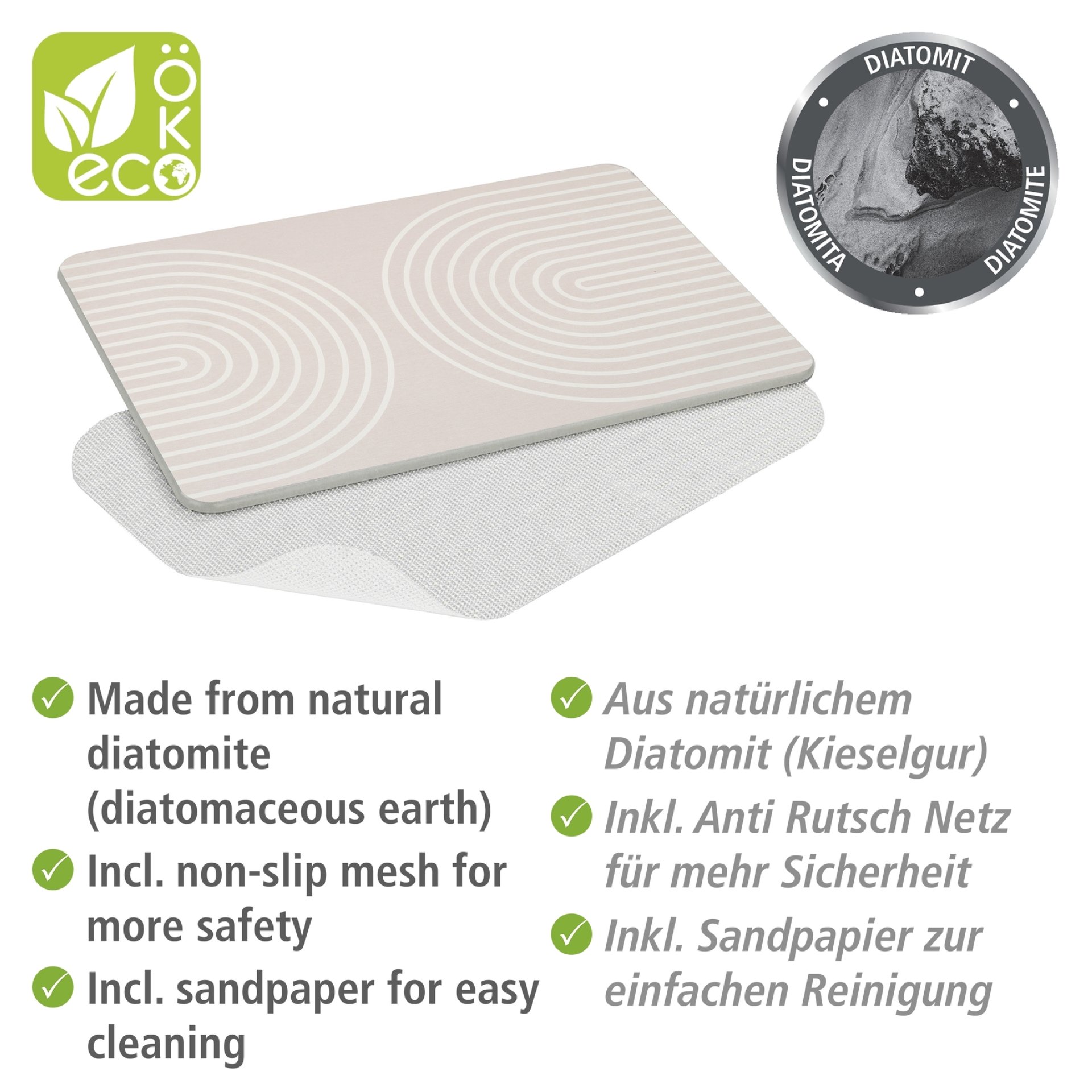 - Der dekorative Badvorleger in Grau mit einem abstrakten Wellenmuster ist aus natürlichem, langlebigem Diatomit (Kieselgur) mit sehr hohen wasserabsorbierenden und schnelltrocknenden Eigenschaften gefertigt. Die verarbeitete Kieselgur sorgt dank ihrer Diffusionseigenschaft dafür, dass nasse Füße in Sekundenschnelle auf der stabilen Platte trocknen. Die Nässe auf der Mattenoberfläche verschwindet wie durch Zauberhand in kürzester Zeit, sodass modrige Gerüche gar nicht erst entstehen können.
