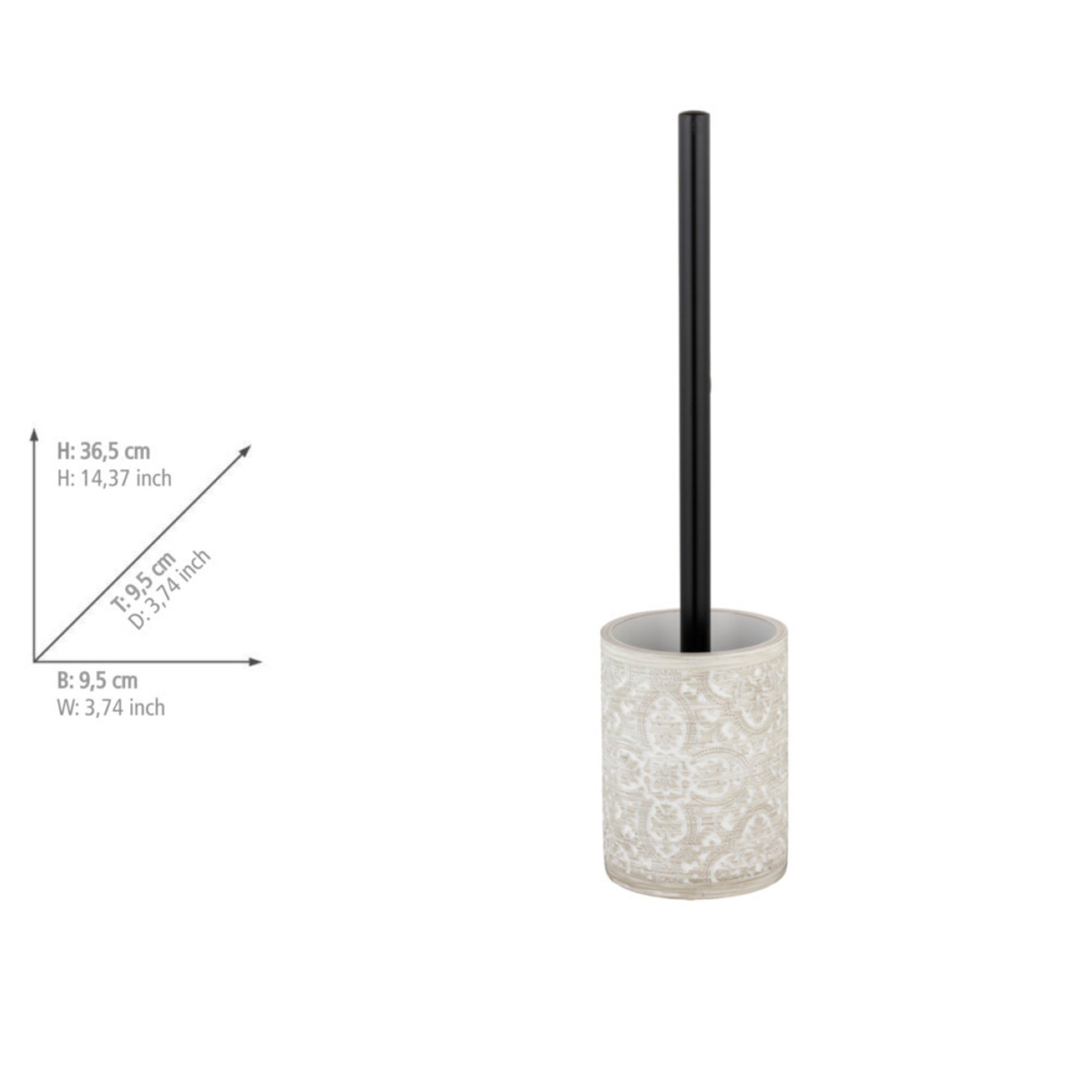 - Die im Set enthaltene WC-Garnitur ist eine optisch ansprechende Aufbewahrungslösung für die Toiletten-Bürste. Die flexible, schwarze Kunststoffabdeckung über dem Silikon-Bürstenkopf sorgt zusätzlich für Diskretion und verhindert Blicke ins Innere des Behälters. Der auswechselbare Bürstenkopf hat einen Durchmesser von Ø 7,5 cm, die Gesamtmaße der WC-Garnitur betragen (B/T x H): 9,5 x 36,5 cm.