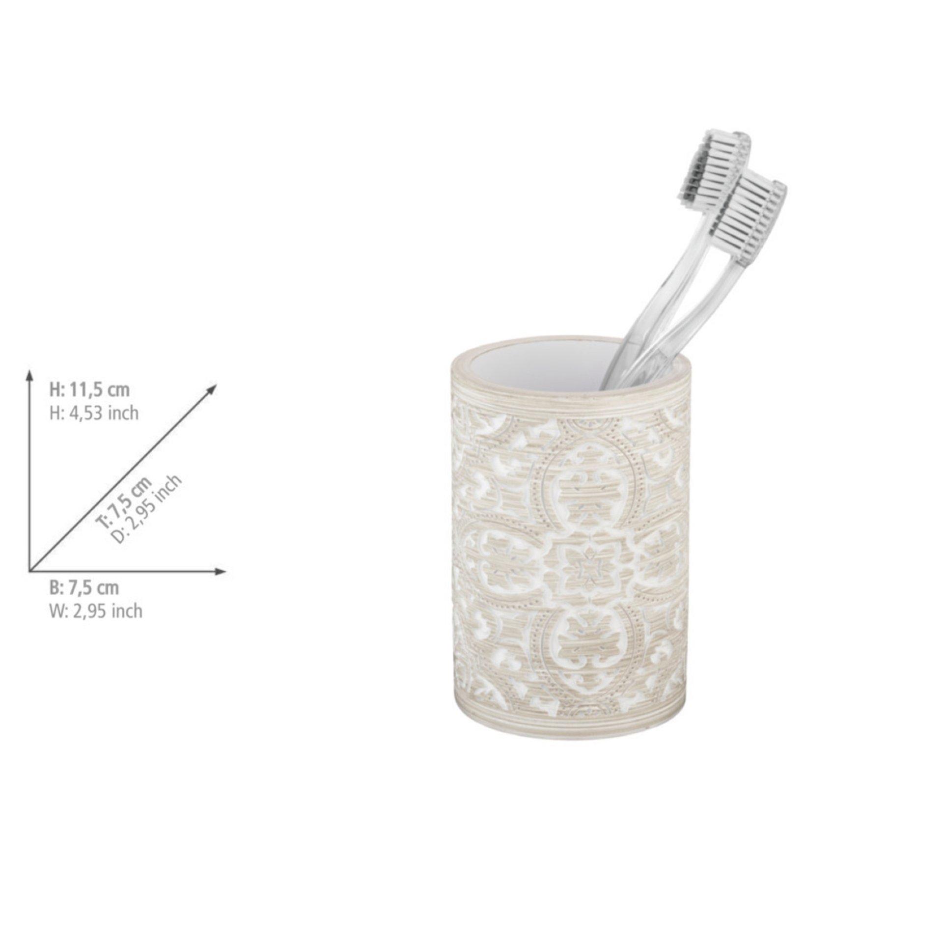- Der Zahnputzbecher der Bad-Serie aus Polyresin ist nicht nur die ideale Ablage für Ihre Zahnpflegeutensilien wie Zahnbürste und Zahnpasta, sondern kann auch zur dekorativen Aufbewahrung von Schmink- und Rasierpinseln genutzt werden. Die Maße des Zahnputzbechers betragen (B/T x H): Ø 7,5 x 11,5 cm.