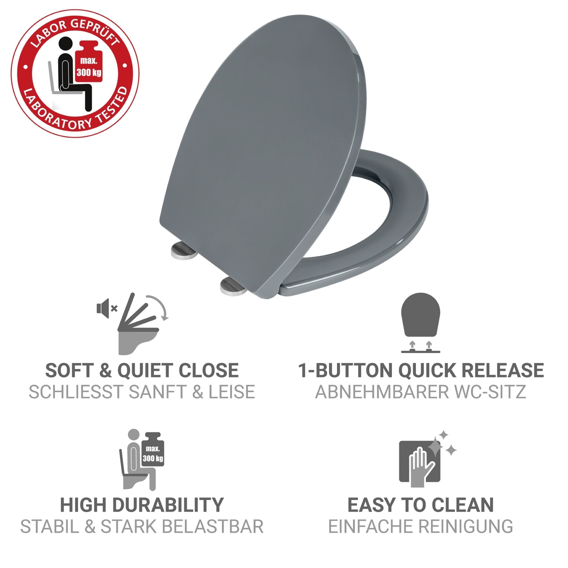 - Mit einer Belastbarkeit von bis zu 300 kg, bestätigt durch ein akkreditiertes Labor, ist dieser bruchstabile WC-Sitz besonders robust und langlebig. Erleben Sie die perfekte Kombination aus Stil und Funktionalität mit dem WC-Sitz Ostuni. Dieser WC-Sitz Grau fügt sich harmonisch in jedes Badezimmer ein und hebt das Gesamtbild Ihres Raumes hervor.