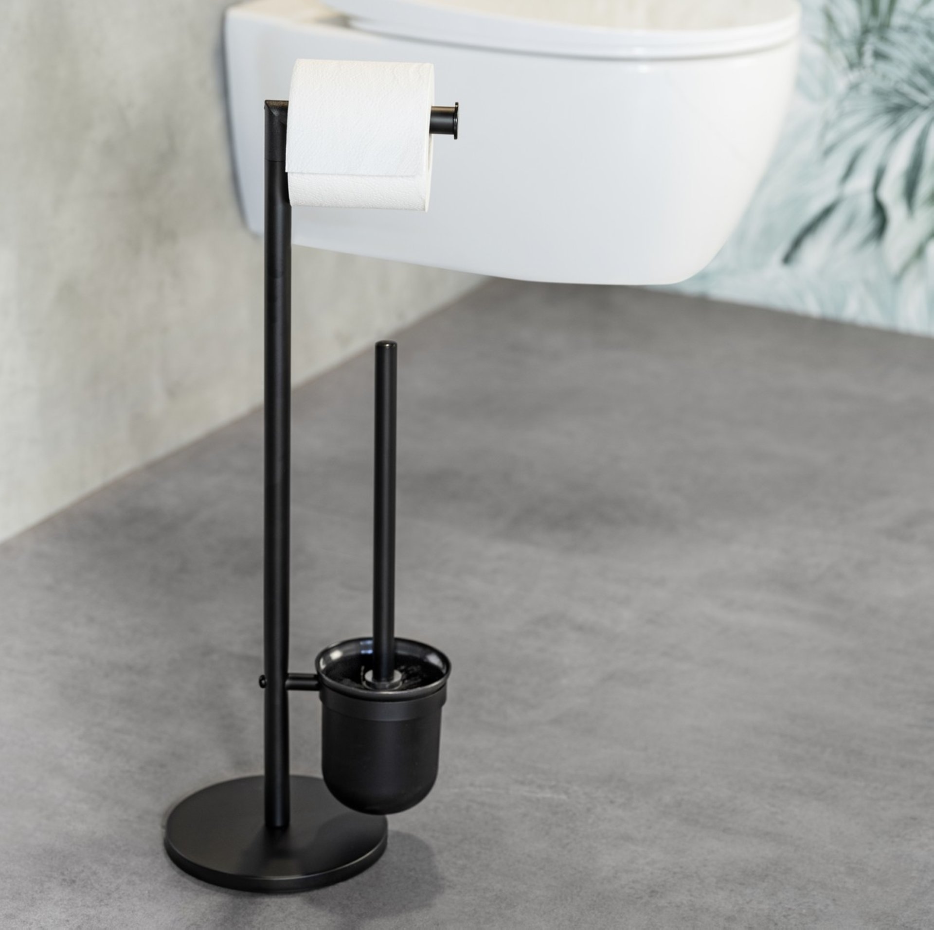 - Der Rollenhalter ermöglicht eine griffbereite Aufbewahrung und ein schnelles Abrollen und Abreißen des Toilettenpapiers. Der offene WC-Bürstenhalter ist aus stabilem, schwarzem Kunststoff gefertigt und der ideale Abstellort für die bereits im Lieferumfang enthaltene WC-Bürste. Die Toilettenbürste verfügt über einen auswechselbaren, schwarzen Bürstenkopf (Ø 8,5 cm) und sorgt für eine gründliche Reinigung der Keramik.