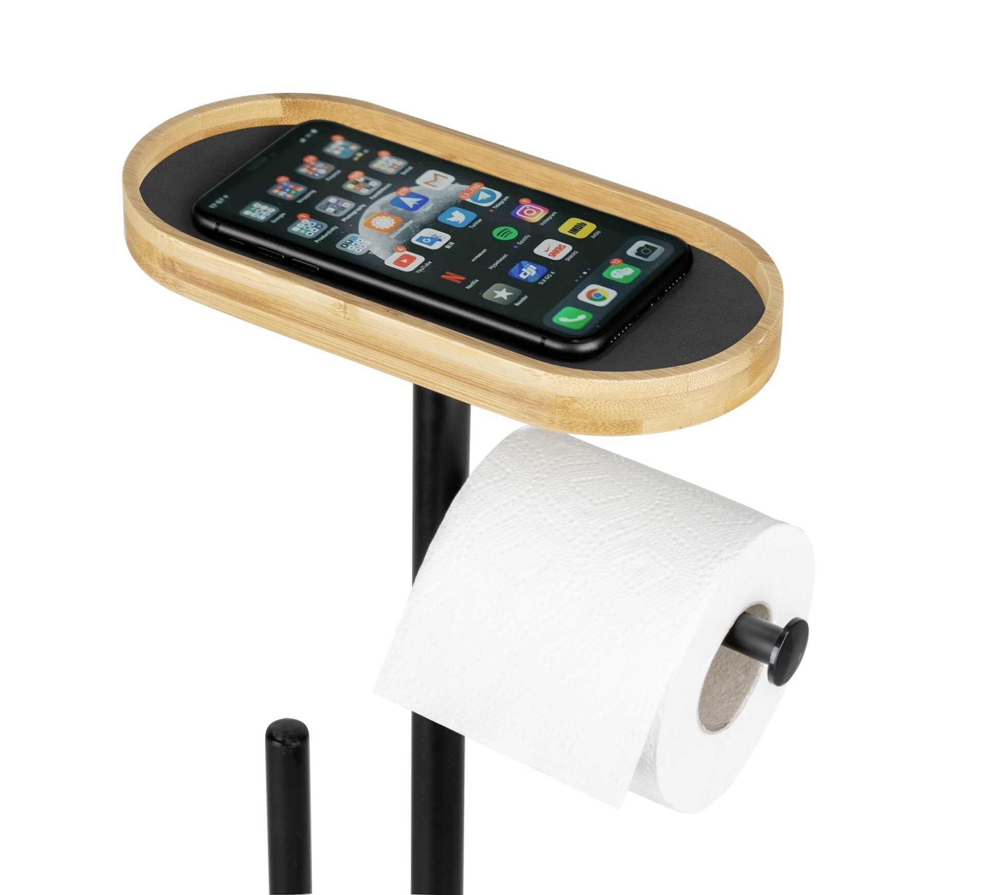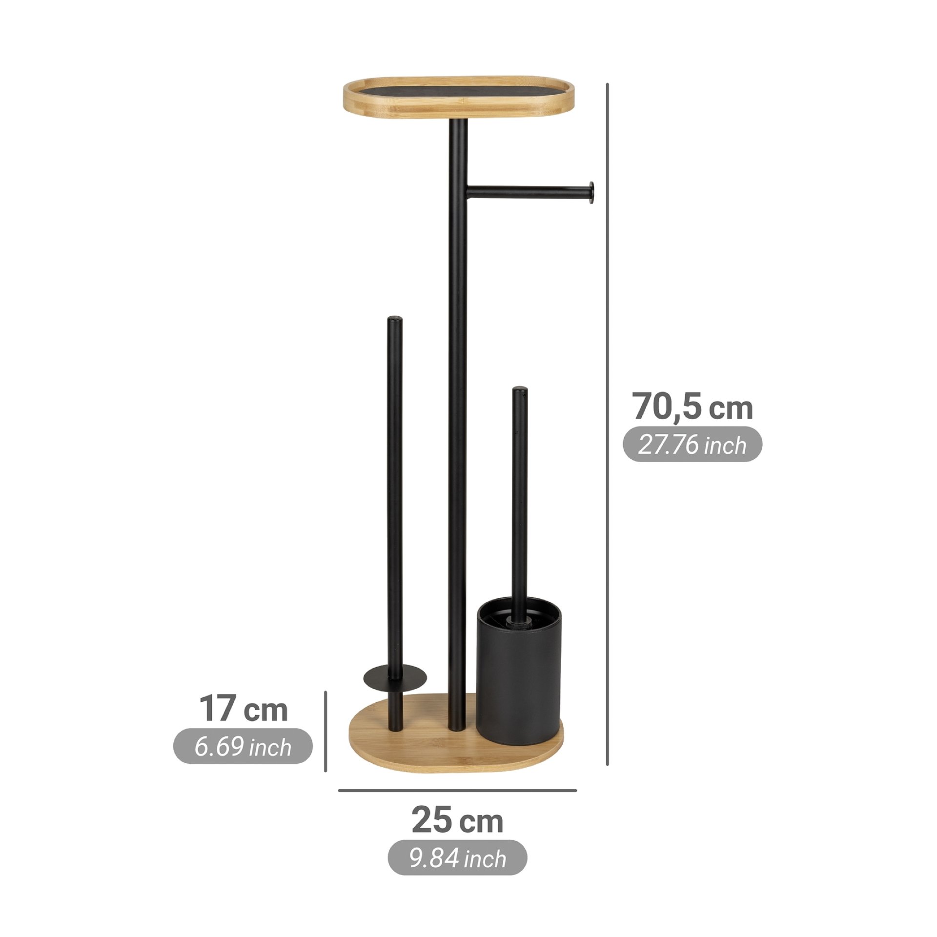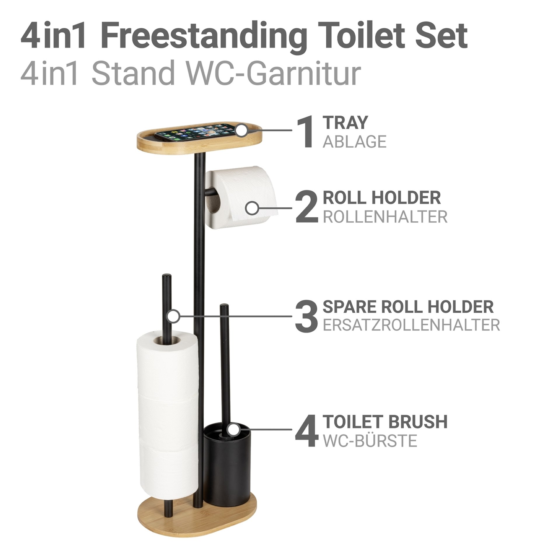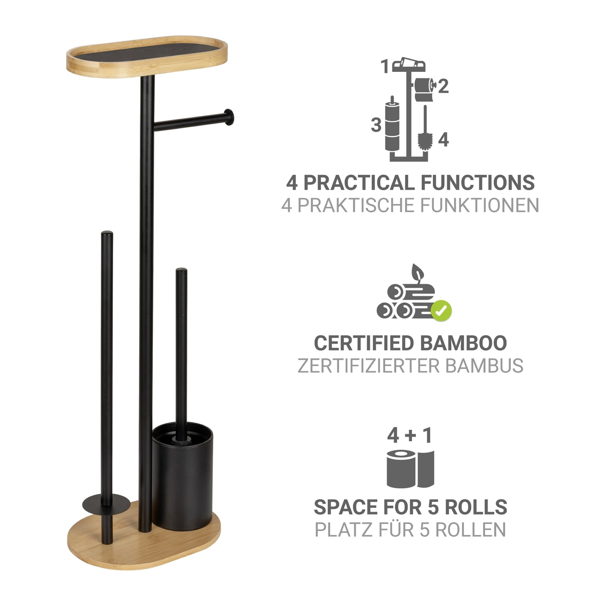 Verleihen Sie Ihrem Badezimmer eine stilvolle Eleganz mit der 4-in-1 Stand WC-Garnitur Pomarolo von WENKO, die aus hochwertigem Bambus und schwarz lackiertem Stahl gefertigt ist. Diese elegante WC-Garnitur Bambus ist nicht nur ein optisches Highlight, sondern auch äußerst praktisch. Sie kombiniert einen Rollenhalter, einen Toilettenpapierhalter Bambus, eine großzügige Ablagefläche sowie eine effektive Toilettenbürste Set in einem einzigen, durchdachten Design.