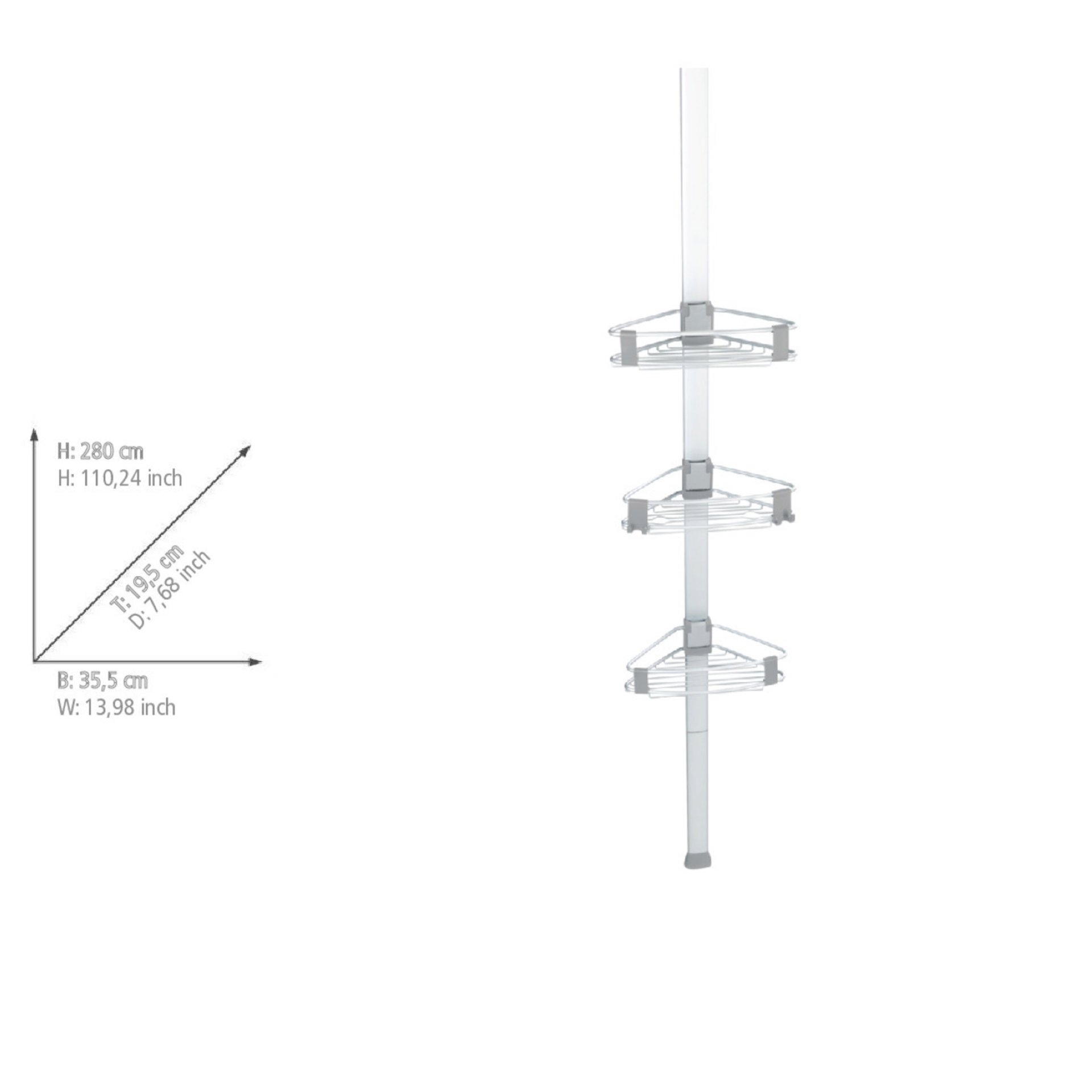 - Das Teleskop-Regal mit den Maßen (B x H x T) 35,5 x 188-280 x 19,5 cm ist in den Farben Grau und Schwarz gehalten und fügt sich damit bestens in die bestehende Inneneinrichtung des Badezimmers ein. Die universelle Einsetzbarkeit in Dusche, Badewanne oder dem restlichen Raum im Bad machen das Utensil zu einem konzeptionell abgerundeten Bad-Accessoire, das Ihnen den Alltag erleichtern wird!
