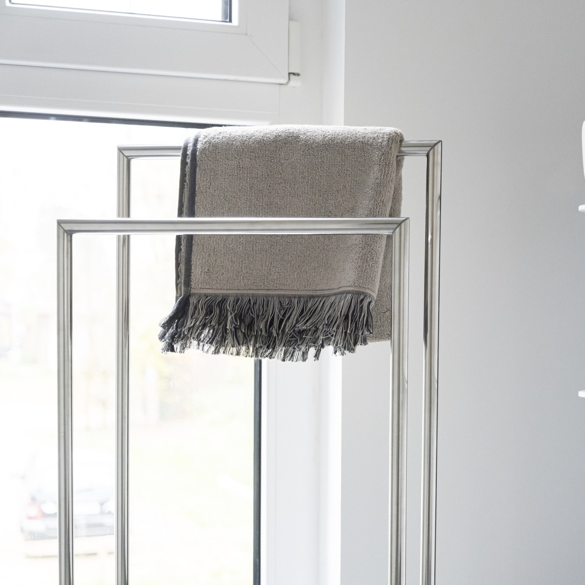 - Nicht nur im Bad macht der Handtuchhalter eine gute Figur. Im Schlafzimmer oder Gästezimmer kann er als Kleiderbutler oder Kleiderständer eingesetzt werden, der Bademäntel und andere Kleidungsstücke zuverlässig trägt.