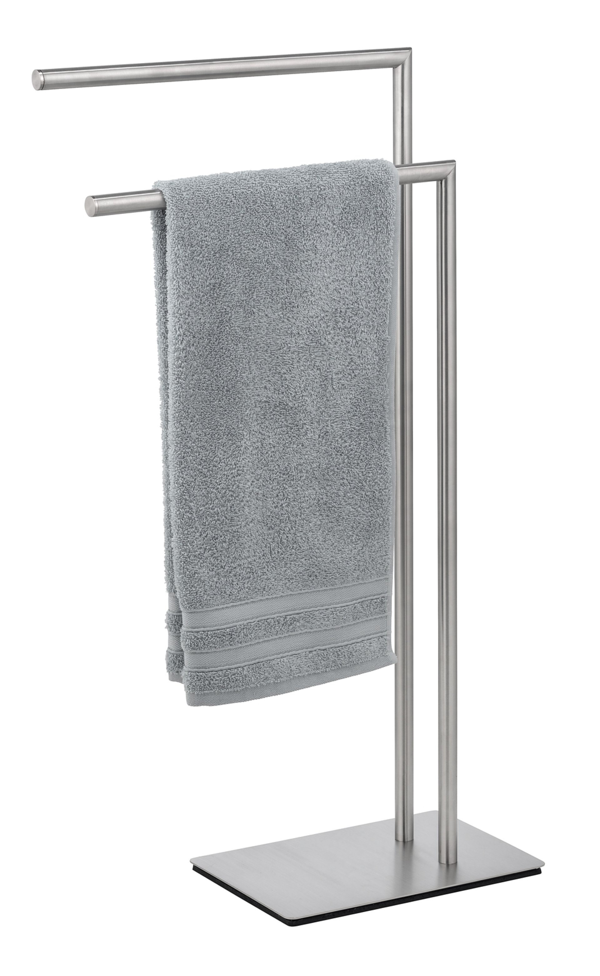 - Hergestellt ist der Handtuchständer aus rostfreiem Edelstahl. Die satinierte Oberfläche sorgt für den zurückhaltend eleganten Look des Bad-Helfers, der sich dank des matten Silbers charmant in jedes Badezimmer einfügt. Die hochwertige, schwere Bodenplatte garantiert einen sicheren Stand.
