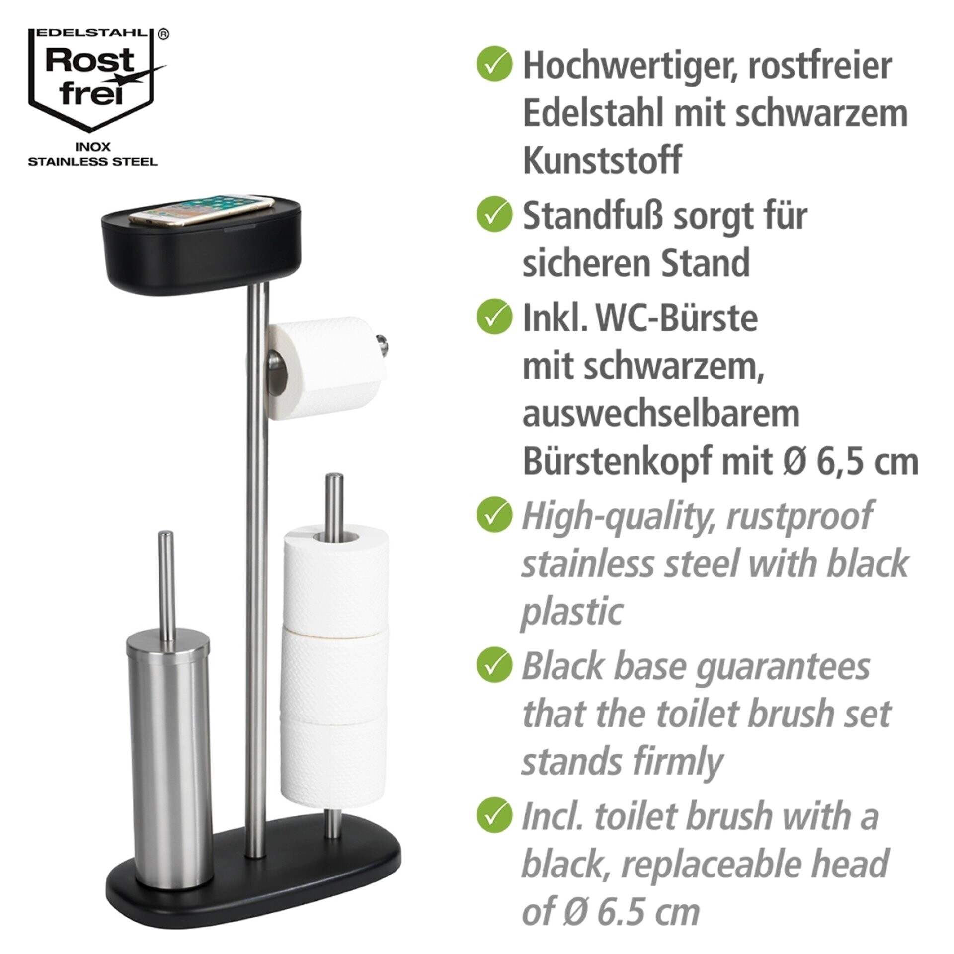 Die hochwertige Stand WC-Garnitur Rivazza ist aus hochwertigem, rostfreiem Edelstahl kombiniert mit schwarzem Kunststoff gefertigt. Die WC-Garnitur überzeugt durch Funktion & Design und setzt dekorative Akzente im Badezimmer und Gäste-WC.