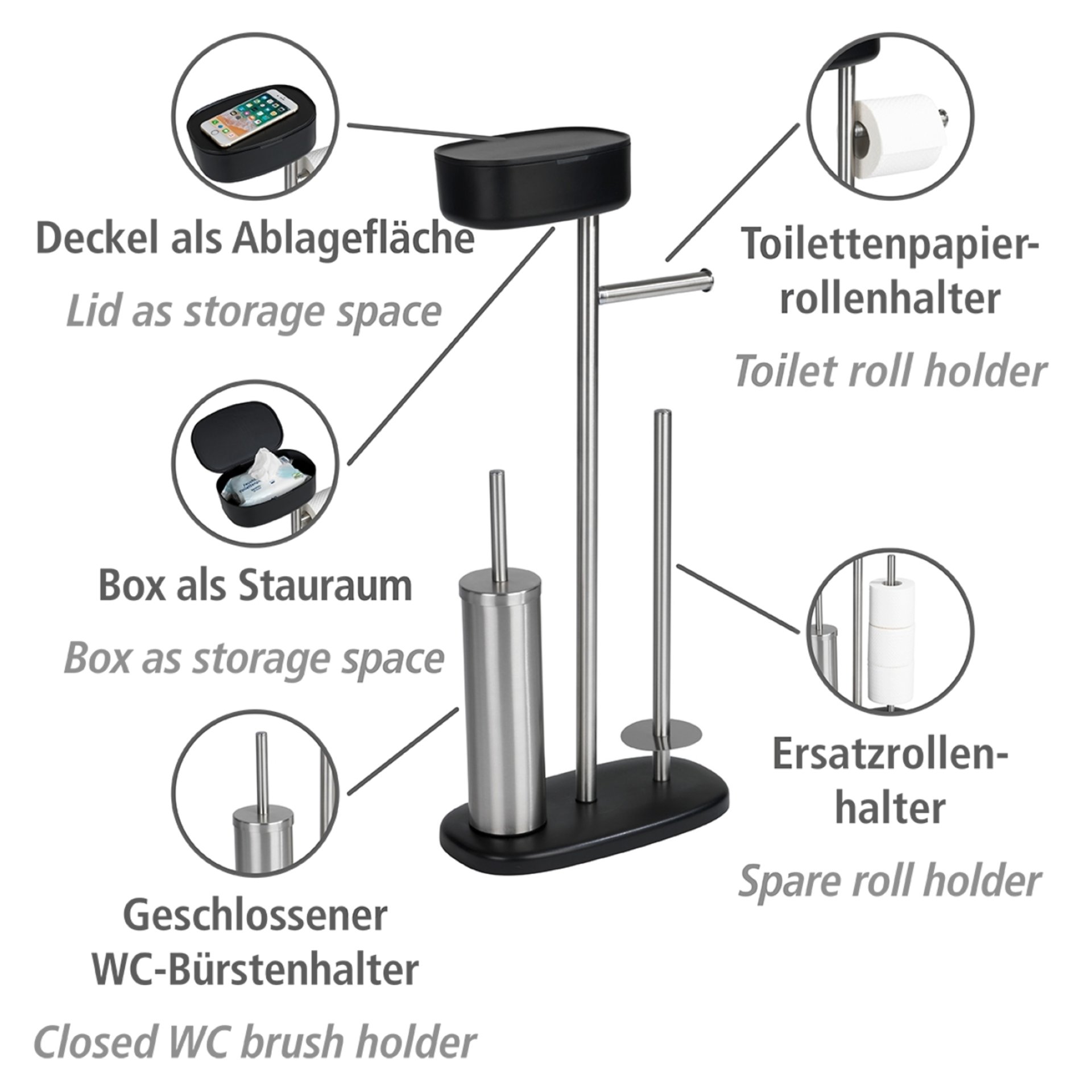 - Die Garnitur bietet 5 Funktionen und ist somit ideal für kleine Bäder. Neben der geschlossenen WC-Garnitur, dem offenen Toilettenpapierrollenhalter für die sofortige Entnahme und dem Ersatzrollenhalter für die Aufbewahrung von bis zu drei weiteren Rollen bietet die clevere Box weiteren Stauraum für feuchtes Toilettenpapier, Damenhygieneartikel oder andere Utensilien. Der praktische Deckel dient zudem als Ablage für Handys etc.