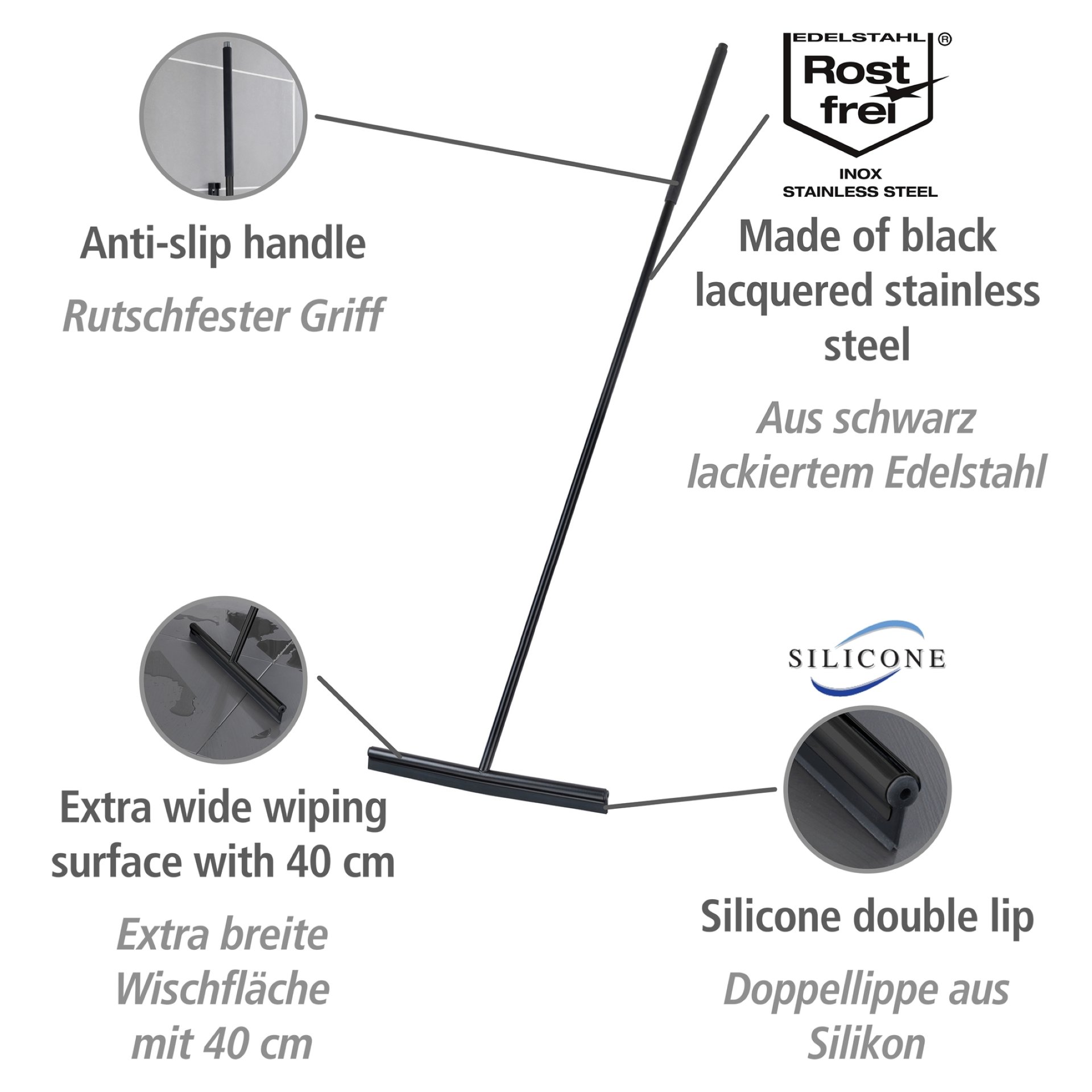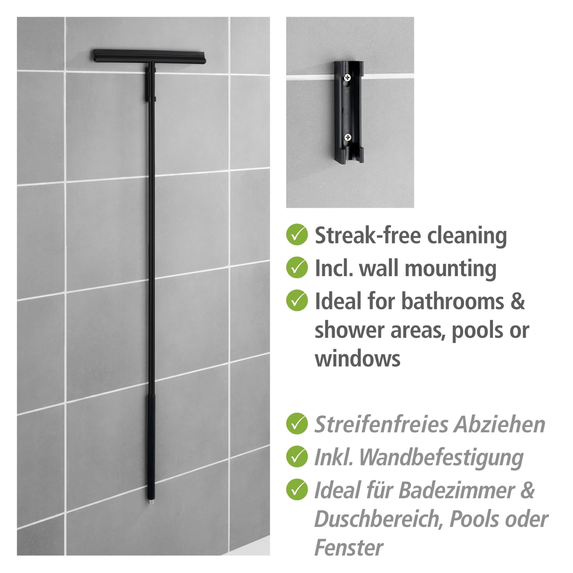 Der hochwertige Boden- und Fensterwischer Rosole Schwarz von WENKO erweist sich als äußerst praktischer Helfer im Badezimmer! Mit seinem extra langen Stiel ermöglicht er ein großflächiges und zudem rückenschonendes Abziehen nasser Flächen.