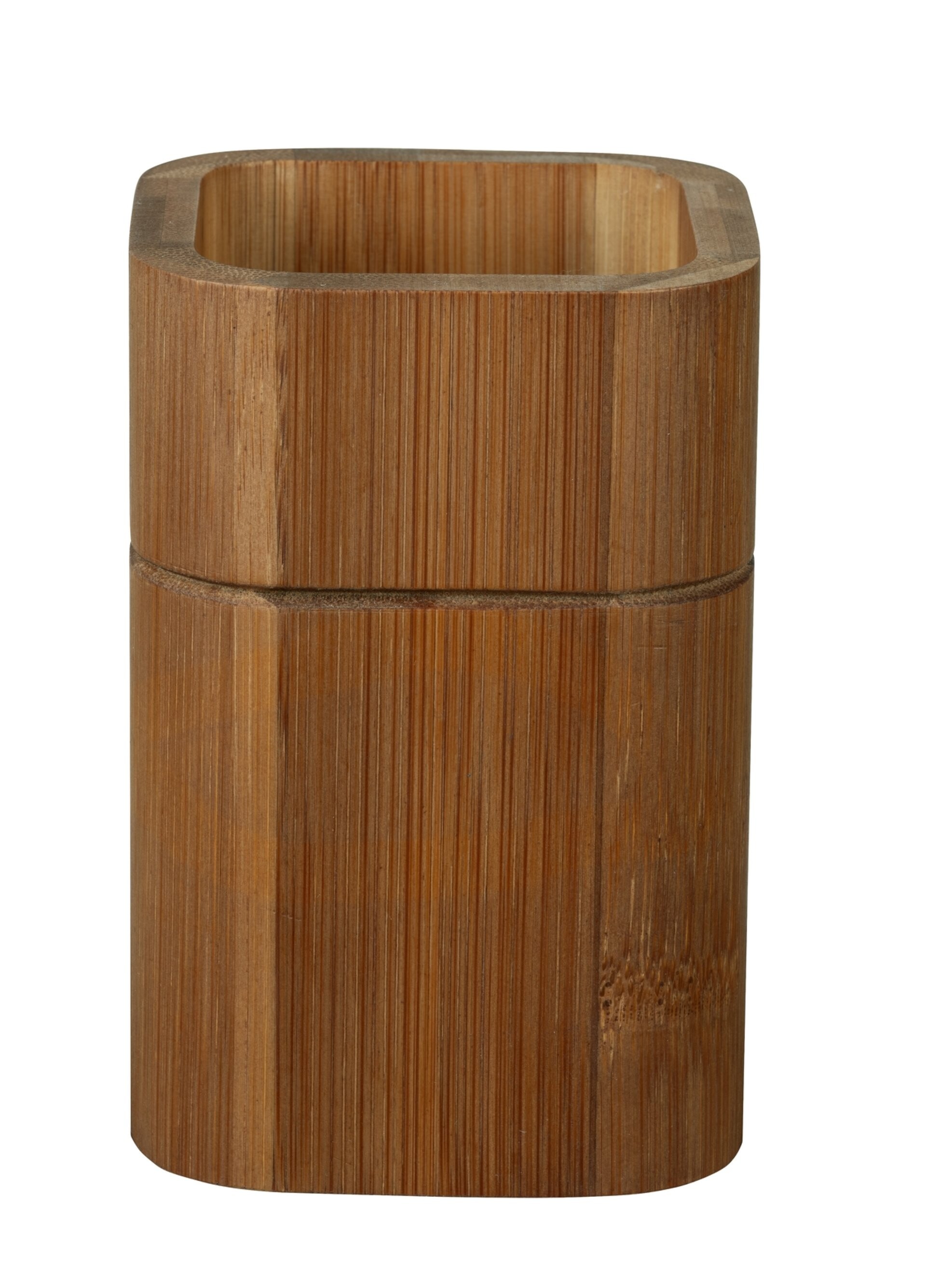 - Der stabile Becher hat eine Größe von (B x H x T): 7,5 x 11 x 7,5 cm. Alternativ lässt sich der Behälter auch als dekorative Aufbewahrung für Stifte oder für Schmink- und Rasierutensilien nutzen. Als reiner Mundspülbecher sollte das Bambusgefäß allerdings nicht verwendet werden, da das Wasser das natürliche Material auf Dauer angreifen und unansehnlich machen würde.
