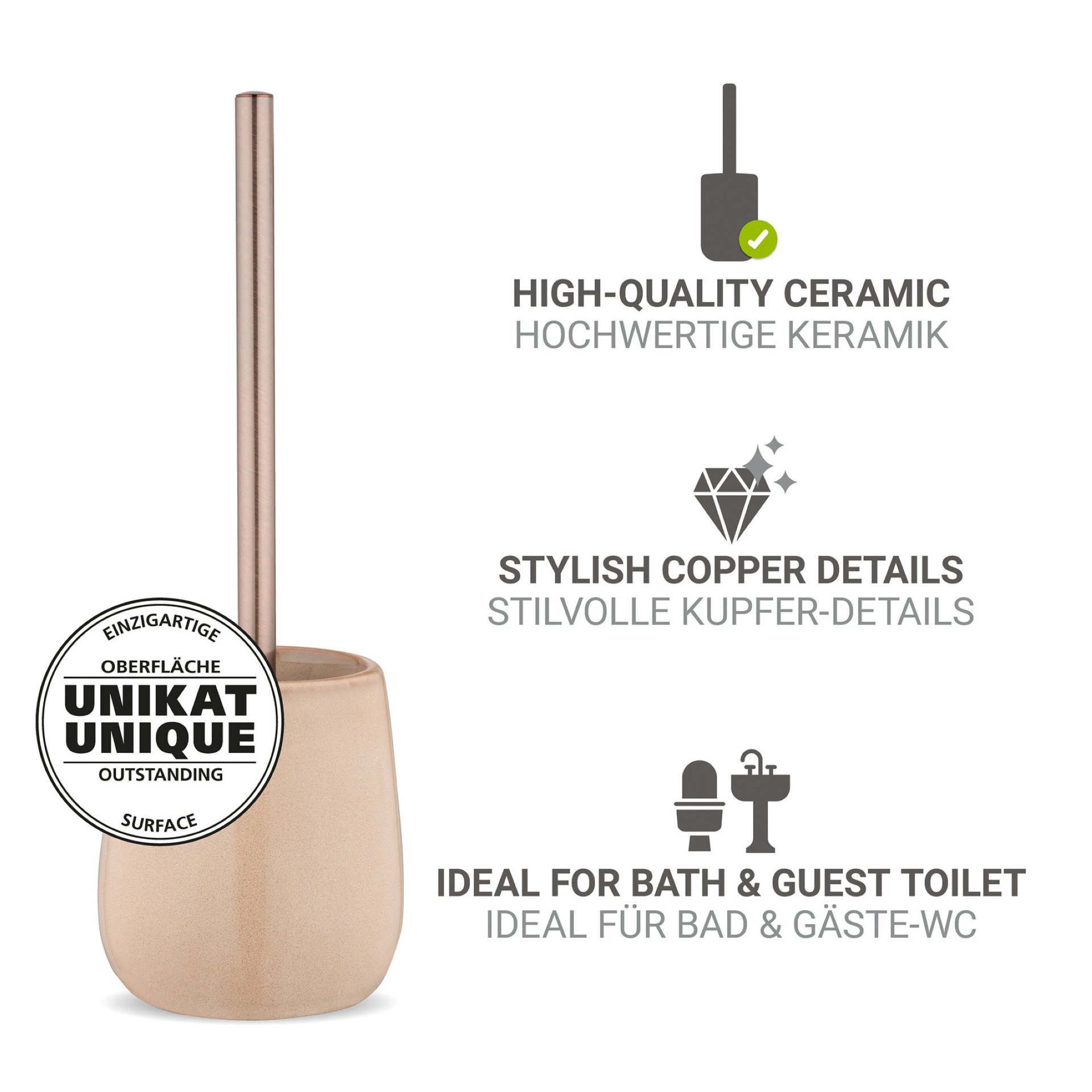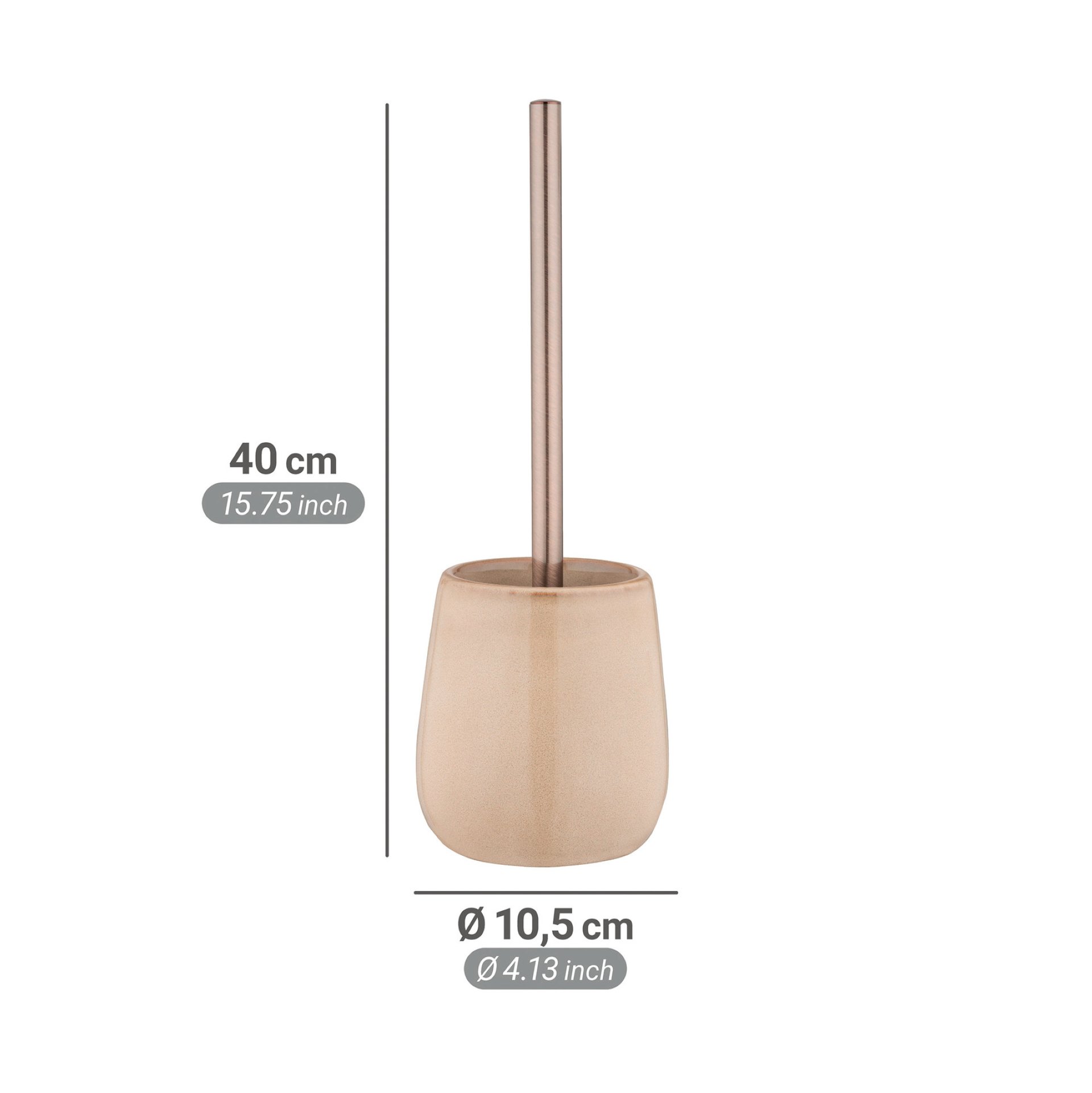 - Die WC-Garnitur Sirmione besticht durch ihr klassisches Design in Beige und Kupfer, das sich harmonisch in jedes Badezimmer einfügt. Der robuste Zylinder aus hochwertiger Keramik garantiert Stabilität und Langlebigkeit. Die flexible Kunststoffabdeckung in Schwarz setzt einen modernen Akzent. Mit einem Durchmesser von 10,5 cm und einer Höhe von 40 cm ist diese freistehende WC-Garnitur sowohl platzsparend als auch funktional.