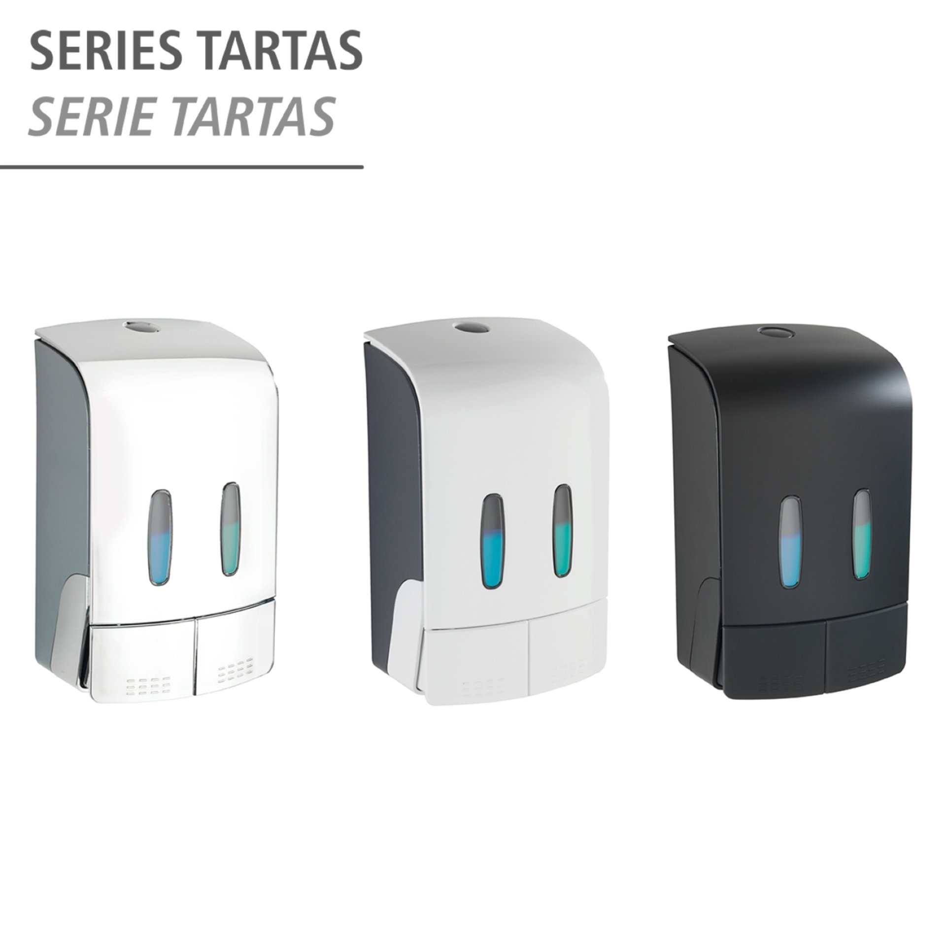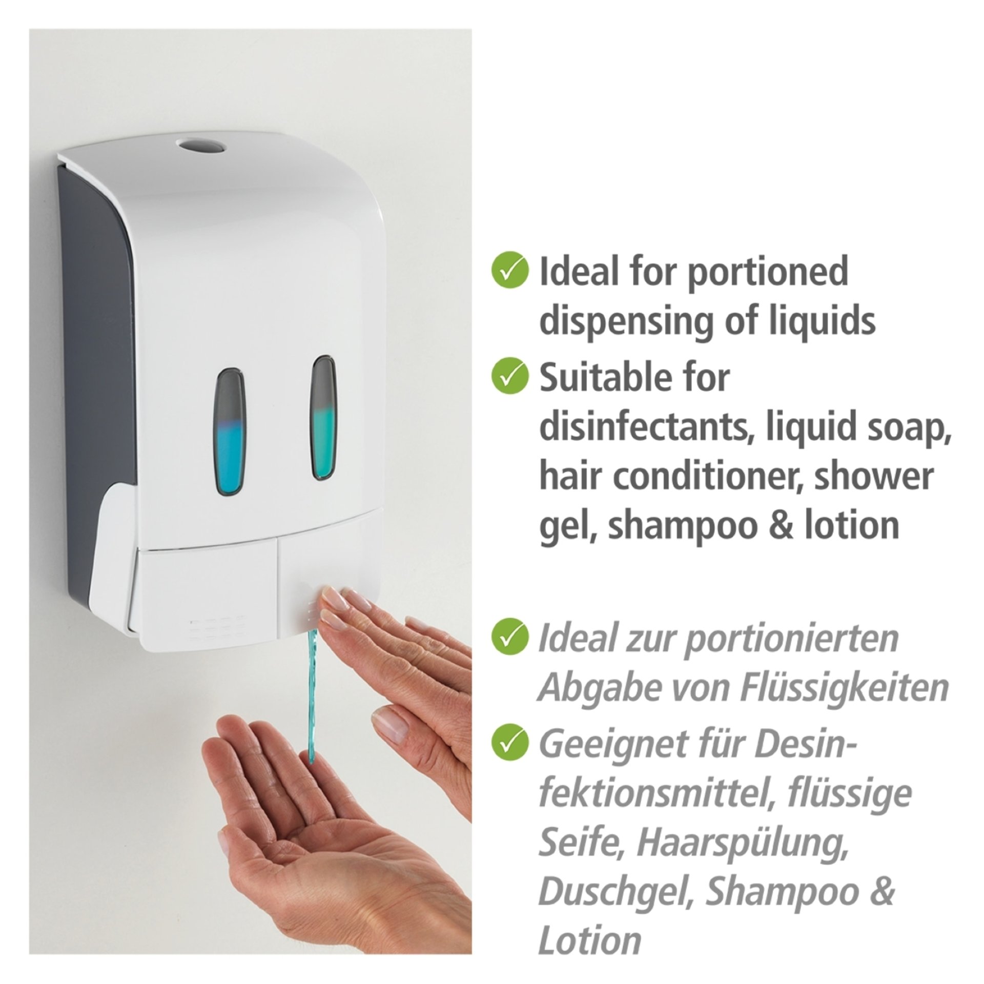 - Der 2-Kammer Desinfektionsmittelspender und Seifenspender Tartas Weiß ist aus hochwertigem Kunststoff gefertigt und eignet sich ideal zur portionierten Abgabe von Flüssigkeiten wie Desinfektionsmittel, flüssige Seife, Haarspülung, Duschgel, Shampoo & Lotion in Bad, Dusche und WC.
