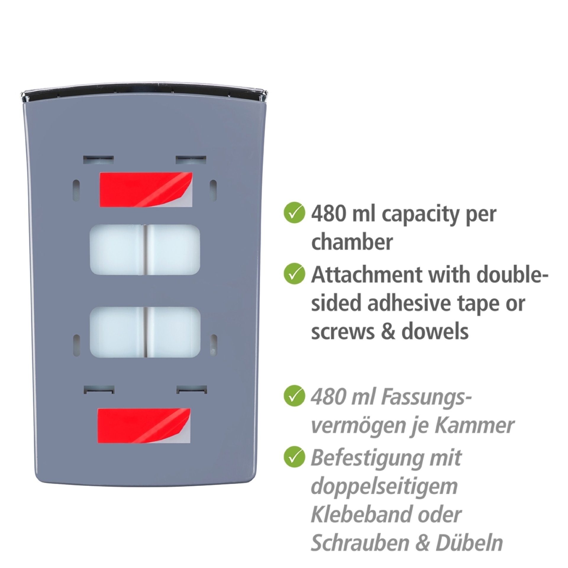 - Ganz einfach auf Knopfdruck erhält man die gewünschte Menge. Die beiden Kammern sind individuell bis zu je 480 ml befüllbar, so dass in die eine Kammer beispielsweise Desinfektionsmittel und in die andere Seife gefüllt werden kann. So hat man einen zweifachen Verwendungszweck in einem Spender.