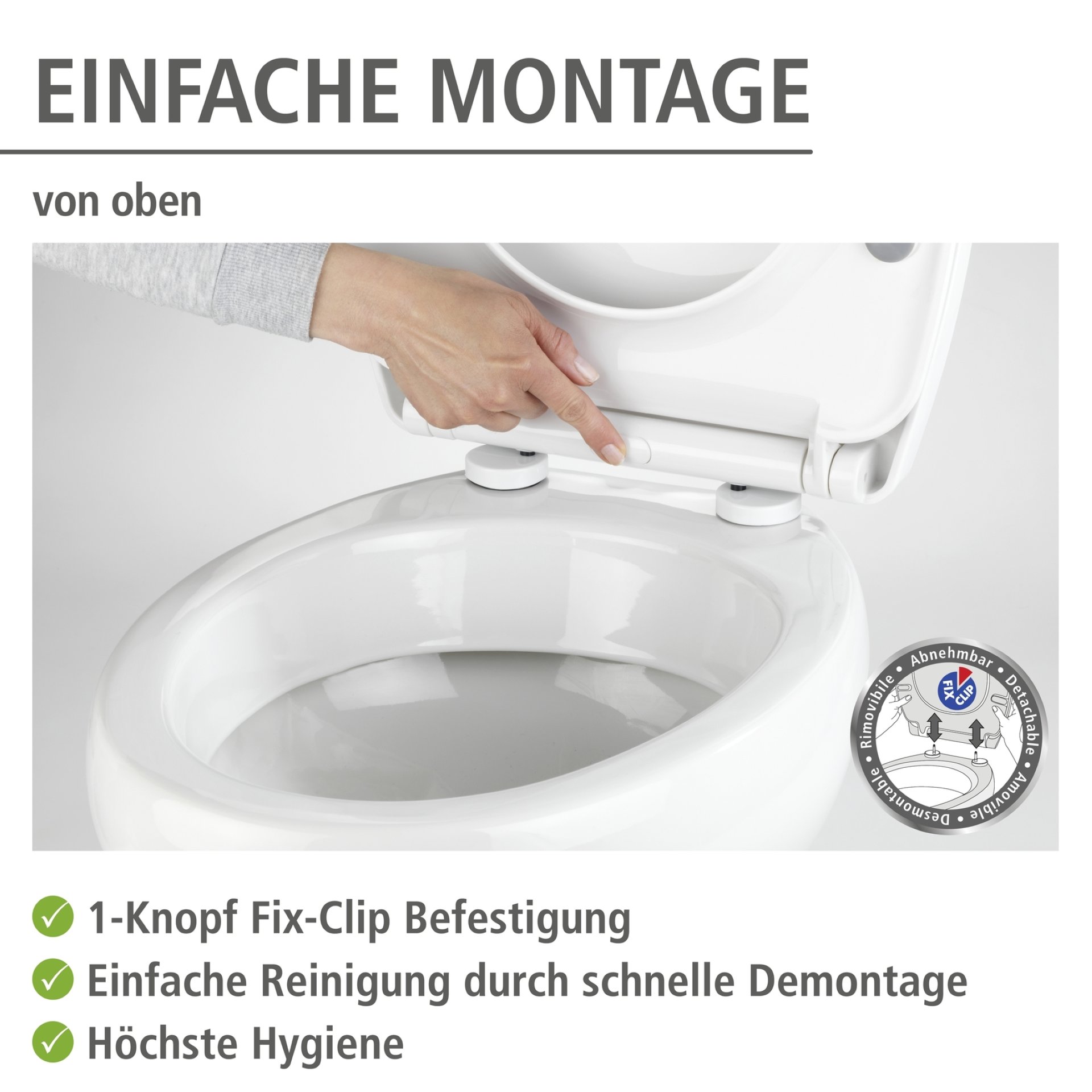 - Außerdem sorgt ein mitgelieferter Wandpuffer von WENKO für leises Öffnen des Deckels, was den Komfort im Bad erhöht. Der Puffer wird einfach unauffällig an der Stelle der Wand montiert, die der WC-Deckel beim Öffnen berührt. Mit der Fix-Clip Hygienebefestigung aus Kunststoff kann der WC-Sitz jederzeit ganz einfach durch Drücken des angebrachten Knopfes von oben abgenommen und wieder aufgesteckt werden. Dadurch lassen sich auch die normalerweise schwer erreichbaren Winkel zwischen den Scharnieren ganz einfach Säubern.