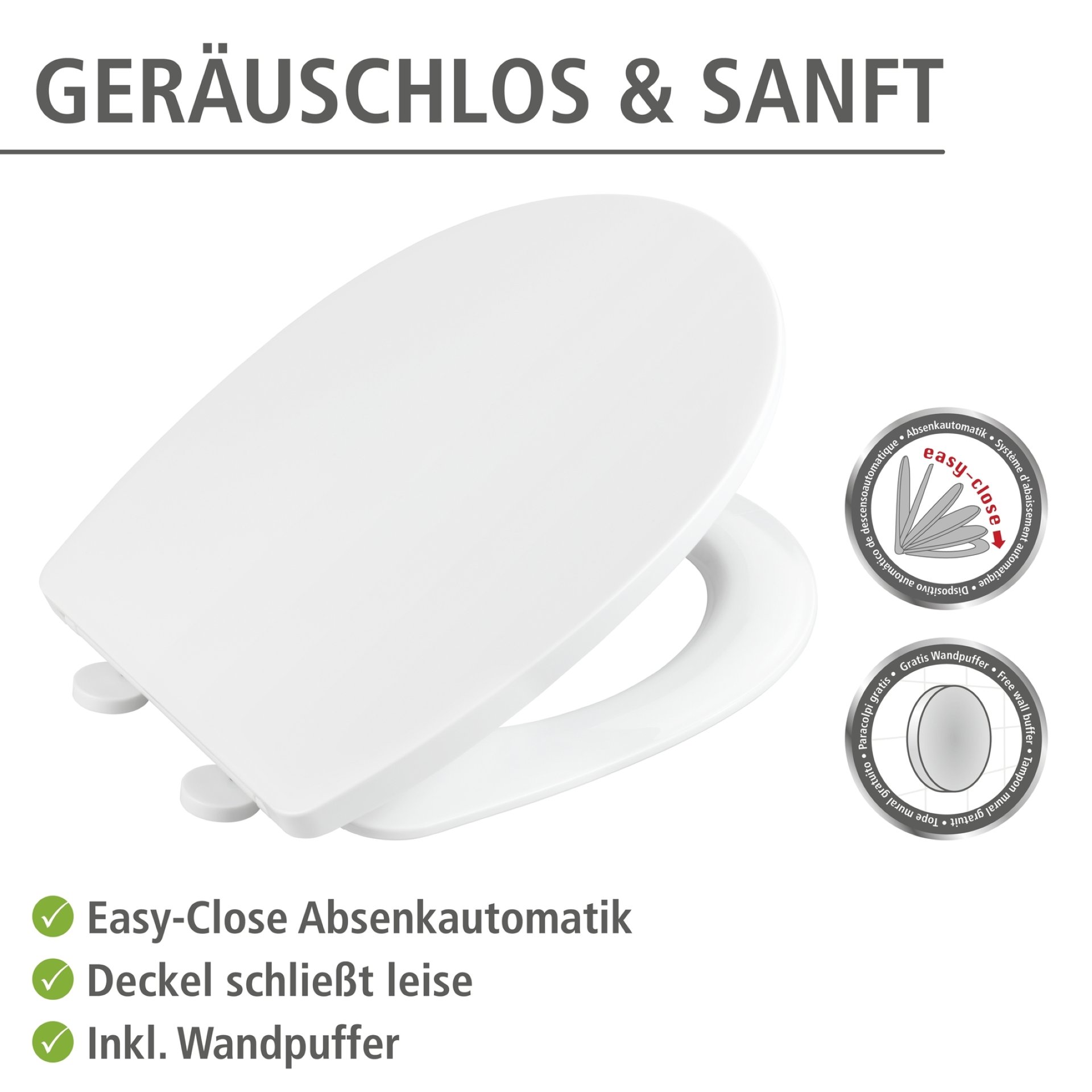 - Die integrierte Easy-Close Absenkautomatik minimiert störende Geräusche von zuklappenden WC-Sitzen und macht Schluss mit Fingerquetschen. Leichtes Antippen genügt bei der Absenkautomatik - und schon schließen WC-Deckel und WC-Brille ganz sanft und leise.