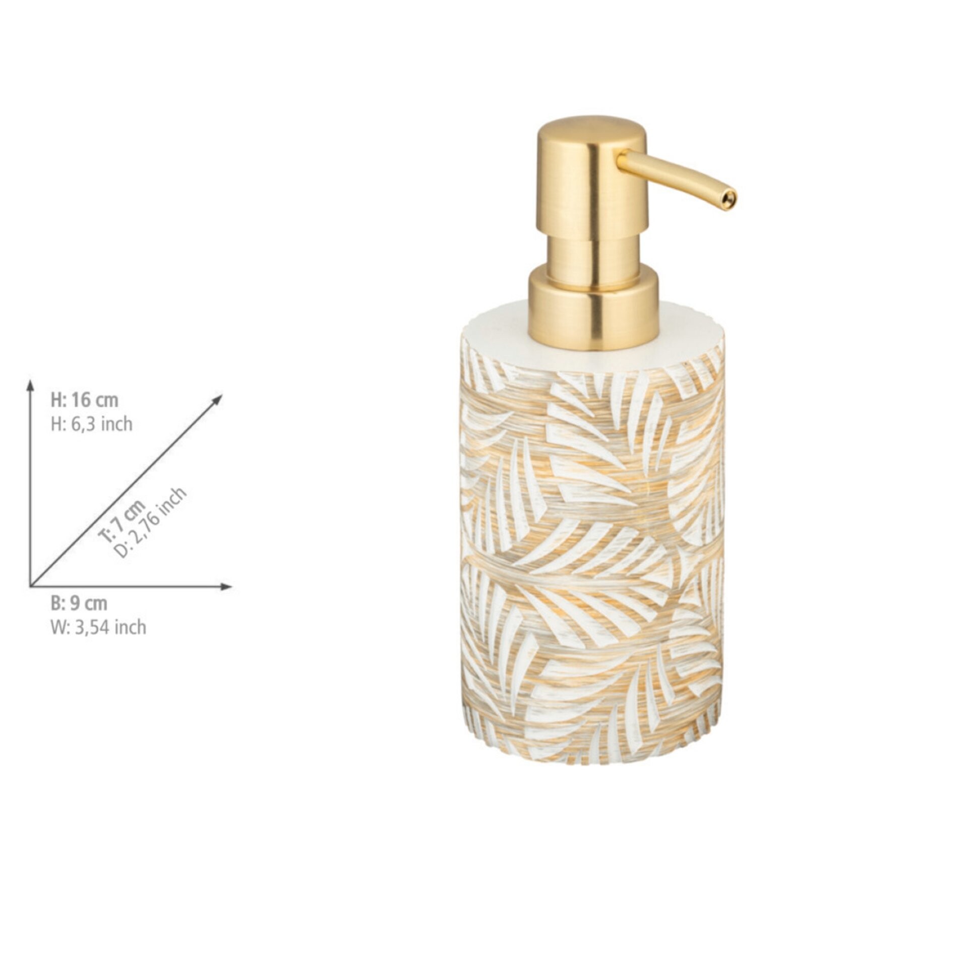 - Mit dem zweiteiligen Bad-Accessoire Set Terralba erhalten Sie ein praktisches Duo aus Seifenspender und Zahnputzbecher, das den Waschtisch um zwei elegante wie nützliche Badhelfer bereichert. In den nachfüllbaren Spender passen bis zu 490 ml Flüssigseife, die durch den Kunststoff-Pumpkopf in goldener Optik leicht zu dosieren ist. Auch als edler Spülmittelspender in der Küche macht das Accessoire einiges her. Insgesamt hat der Seifenspender Abmessungen von (B x H x T): 9 x 16 x 7 cm und passt somit ideal auf Wasch- und Spülbeckenränder.