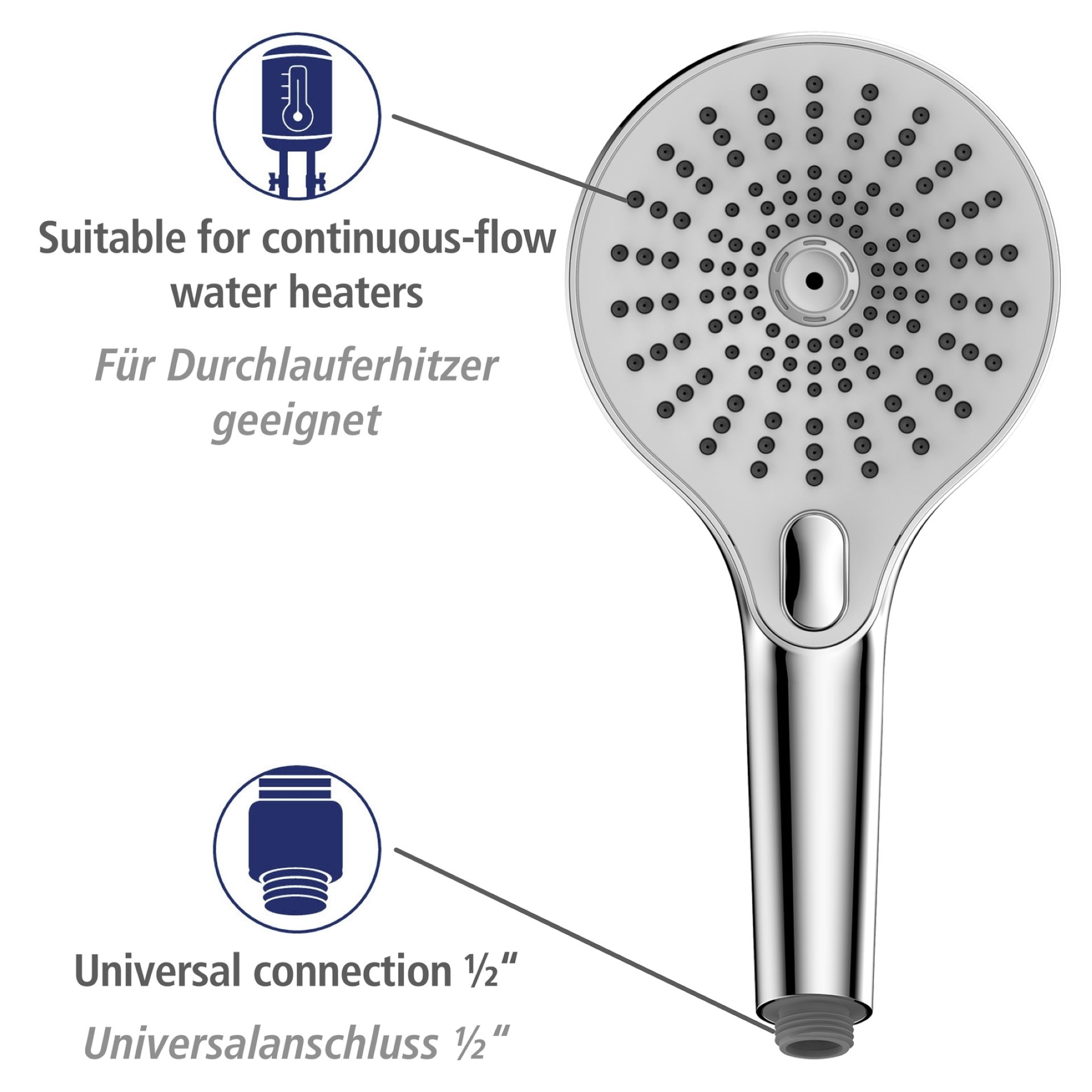 - Hergestellt ist der Duschkopf mit einem Durchmesser von Ø 13 cm aus stabilem Kunststoff (ABS). Durch die Noppen an der Brause lässt er sich leicht reinigen. Etwaige Kalkablagerungen an den Düsen können einfach mit dem Finger abgerieben werden. Der langlebige Duschkopf verfügt über einen Universalanschluss ½“ und ist auch für Duschen mit Durchlauferhitzer geeignet.